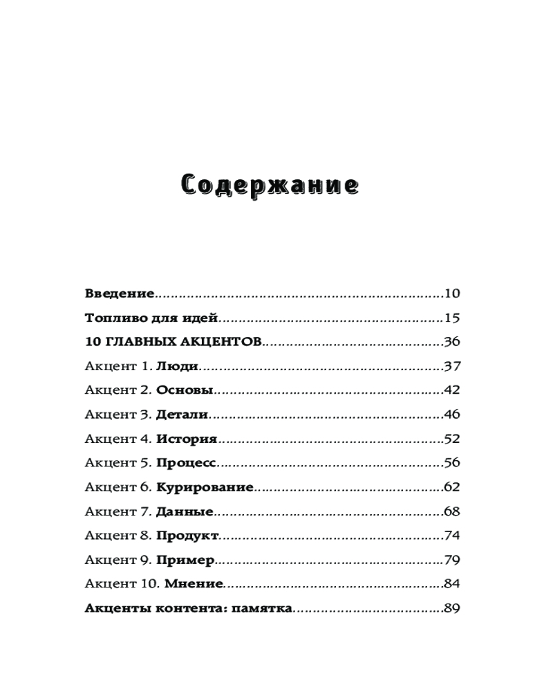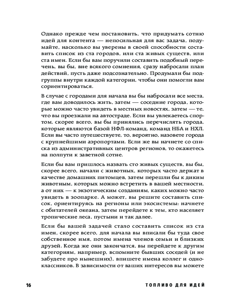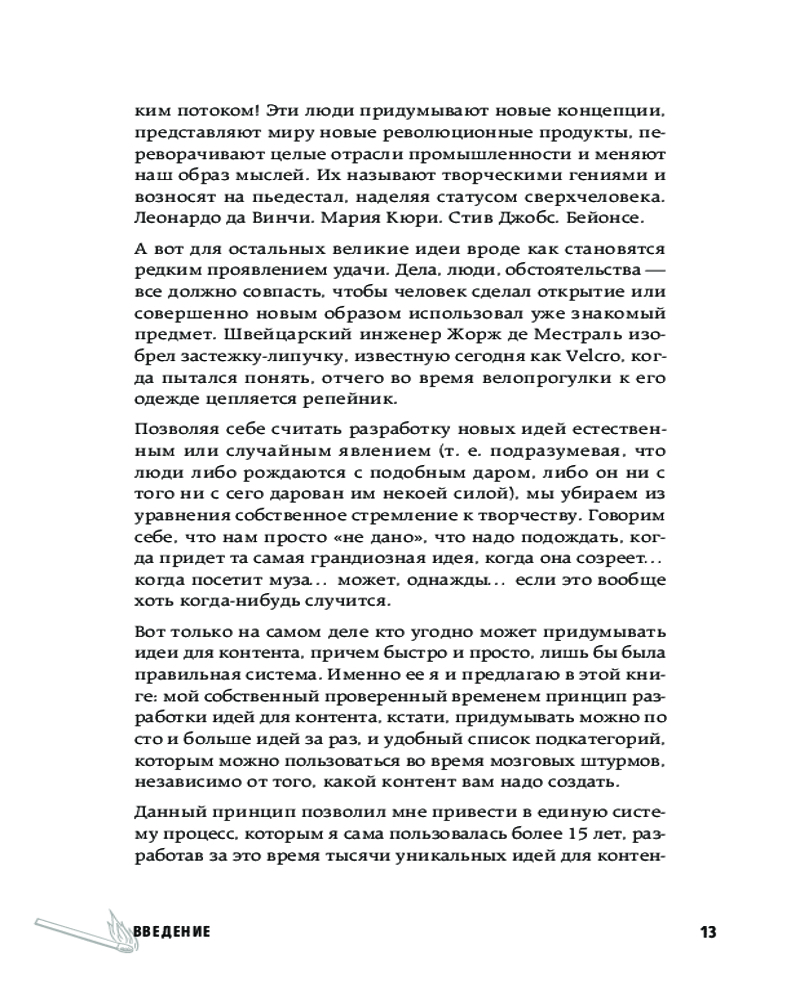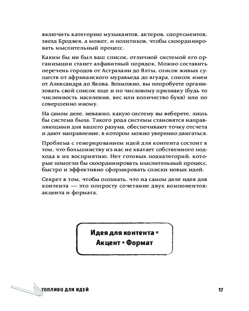 Подход «Акцент + Формат» — это простой, но крайне эффективный способ придумывать множество различных идей для контента. Кстати, придумывать можно по 100 и больше идей за раз, и удобный список подкатегорий, которым можно пользоваться во время мозговых штурмов, независимо от того, какой контент вам надо создать. Дочитывая последние страницы, вы уже обзаведетесь блокнотом, полным новых идей для контента, а еще обретете уверенность в своей способности быстро и с легкостью генерировать новые стратегические идеи. |