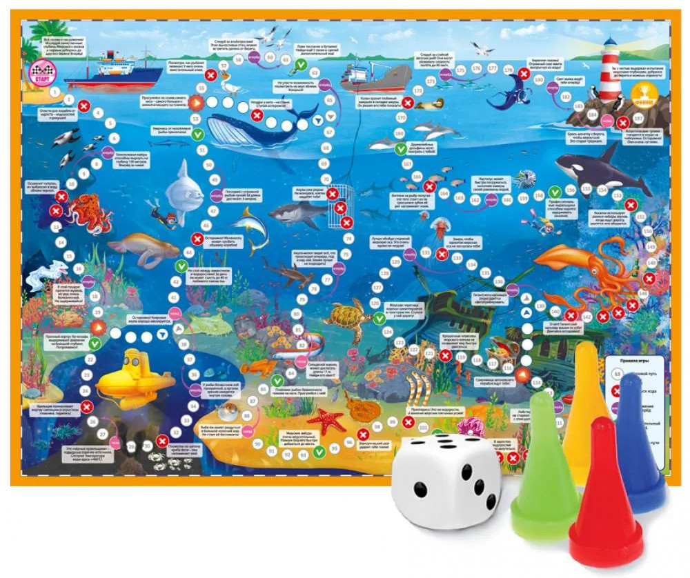 Игра-ходилка с фишками «В океане»В данный момент этот товар отсутствует в продаже. Возможно, у нас найдется аналогичный или похожий товар здесь. Серия: Игра-ходилка с фишками для малышей Настольная игра-ходилка для любознательных исследователей океана! Отправляйтесь в водные пучины и исследуйте подводный мир: знакомьтесь с обитателями коралловых рифов, ищите загадочные сокровища морских глубин, представителями водного мира — акулами, черепахами, ламантинами, крабами и бесчисленными видами рыб. Отправиться в путешествие можно всей семьей — в игре могут участвовать от 2х до 4х игроков. Чтобы приключения начались — просто бросайте кубик! |