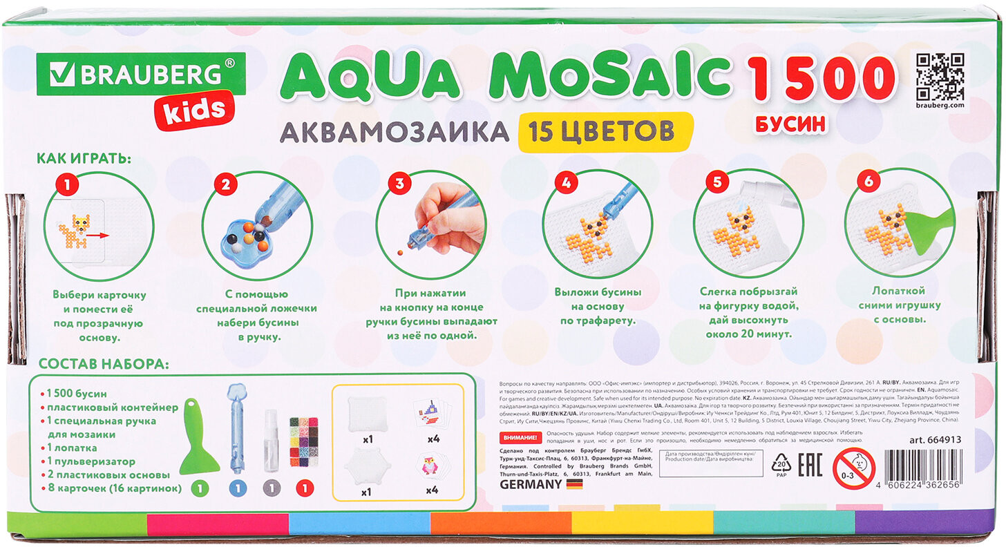 💳 Оплатить за товар можно при получении 🇰🇿 Есть бесплатная доставка по Казахстану от 1 дня 🎁 Копите бонусы с каждой покупки Серия: Классика Аквамозаика Brauberg kids — это набор специальных бусин для создания картинок на трафаретах, входящих в набор. Бусины склеиваются между собой, если побрызгать на них обычной водой. Аквамозаика развивает у ребёнка усидчивость и креативное мышление. |