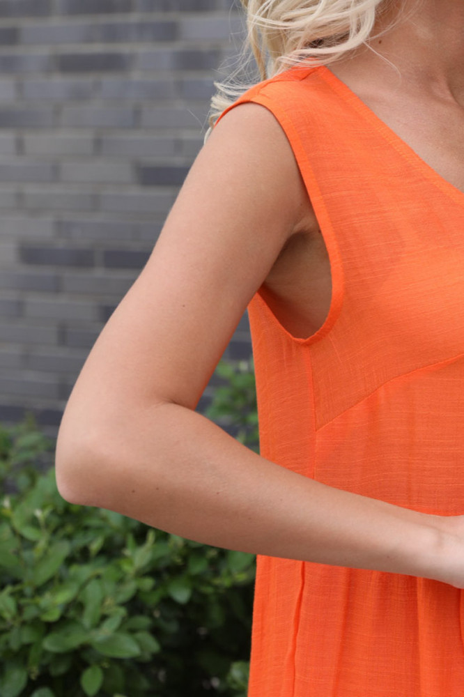 красивый и яркий цвет для лета. ткань полупрозрачная, но ниже шев груди и там уже ткань идет двойная и не просвечиват ниже.