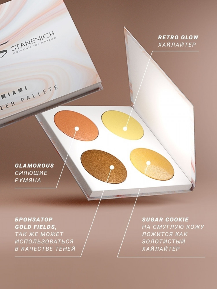 Viktoriya Stanevich Палетка бронзеров «Miami»В данный момент этот товар отсутствует в продаже. Возможно, у нас найдется аналогичный или похожий товар здесь. Бронзатор-хайлайтер Miami поможет подчеркнуть загар или создать такой эффект на светлой коже. Можно использовать вместо румян и в качестве теней для век. Retro Glow, Glamorous, Sugar Cookie, Gold Fields — выберите подходящий оттенок, чтобы придать коже сияние и эффект загара. Легкая текстура позволяет нанести бронзатор ровным слоем, а стойкость — наслаждаться эффектным макияжем в течение всего дня. Средняя дисперсия позволяет использовать текстуру и в лифтинг-макияже. Также эту палитру можно использовать как тени — мягкая шелковистая текстура, легко ложатся, создают роскошный сатиновый эффект. |