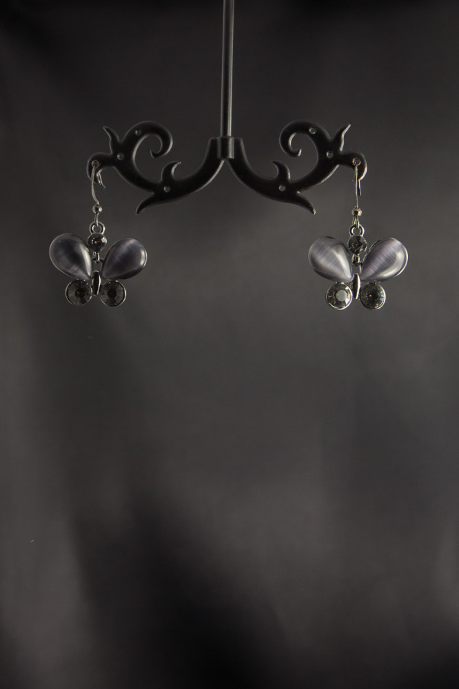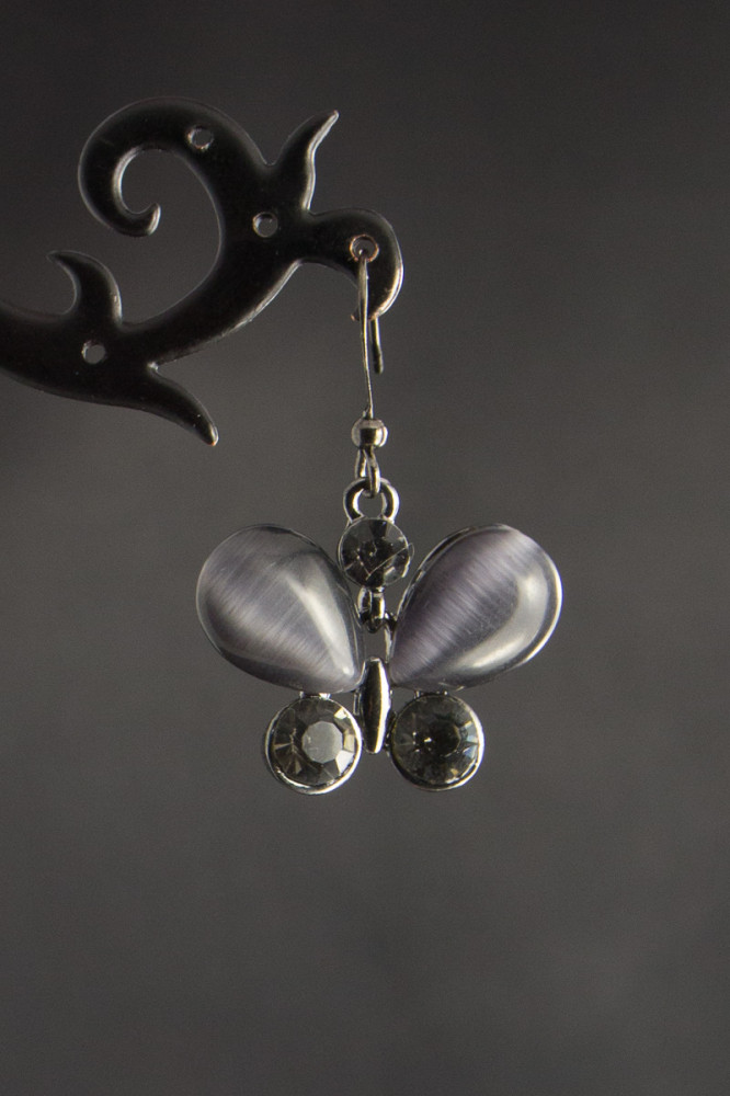 Романтичный образ подчеркнут нежные серьги в виде бабочек и стрекоз. Серьги из металла цвета темного серебра украшены сверкающими стразами и вставками серого цвета, имитирующими камень кошачий глаз. |