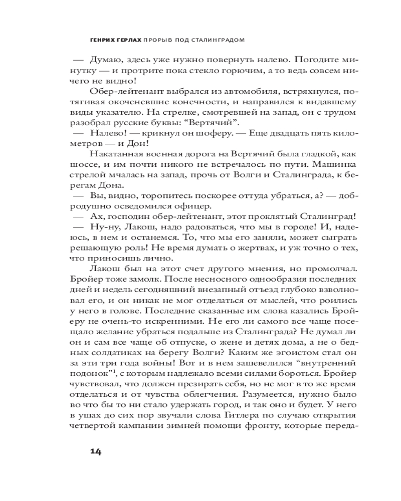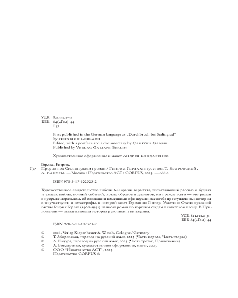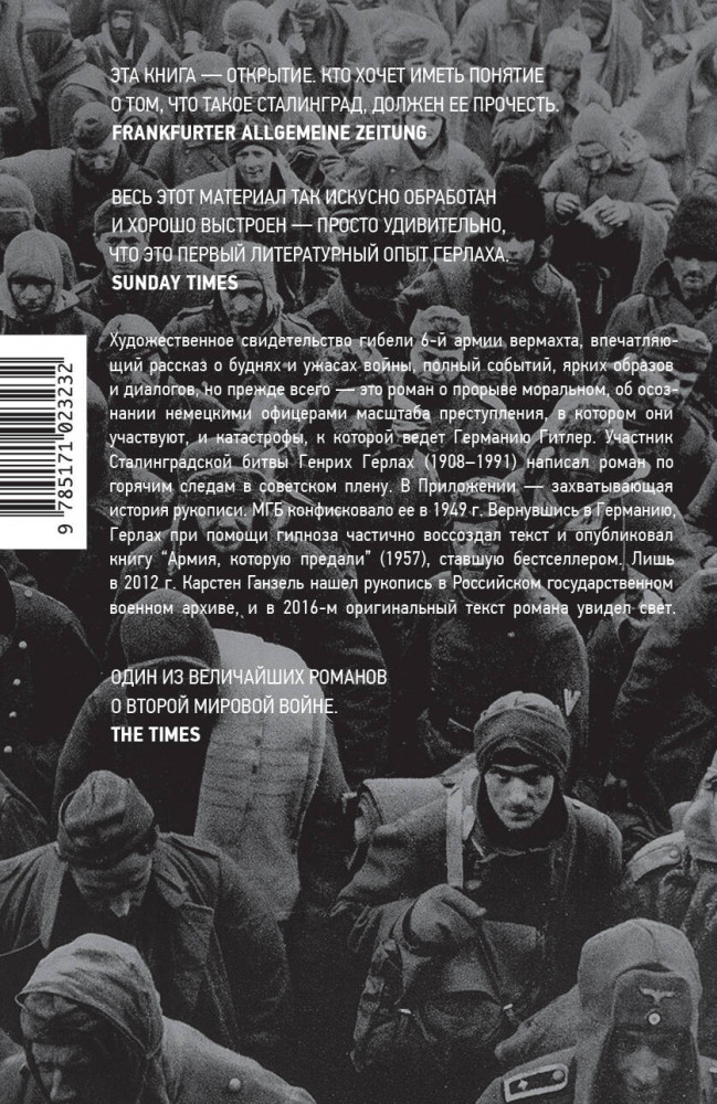 Прорыв под СталинградомВ данный момент этот товар отсутствует в продаже. Возможно, у нас найдется аналогичный или похожий товар здесь. Серия: Corpus Художественное свидетельство гибели 6‑й армии вермахта, впечатляющий рассказ о буднях и ужасах войны, полный событий, ярких образов и диалогов, но прежде всего — это роман о прорыве моральном, об осознании немецкими офицерами масштаба преступления, в котором они участвуют, и катастрофы, к которой ведет Германию Гитлер. Участник Сталинградской битвы Генрих Герлах (1908-1991) написал роман по горячим следам в советском плену. В Приложении — захватывающая история рукописи и ее издания. |