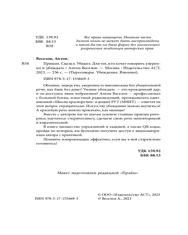 💳 Оплатить за товар можно при получении 🇰🇿 Есть бесплатная доставка по Казахстану от 1 дня 🎁 Копите бонусы с каждой покупки Серия: Переговоры. Убеждение. Влияние У вас есть всего семь секунд, чтобы поймать внимание собеседника! И 30 секунд, чтобы закрепить результат и увлечь за собой при помощи красивой речи! |