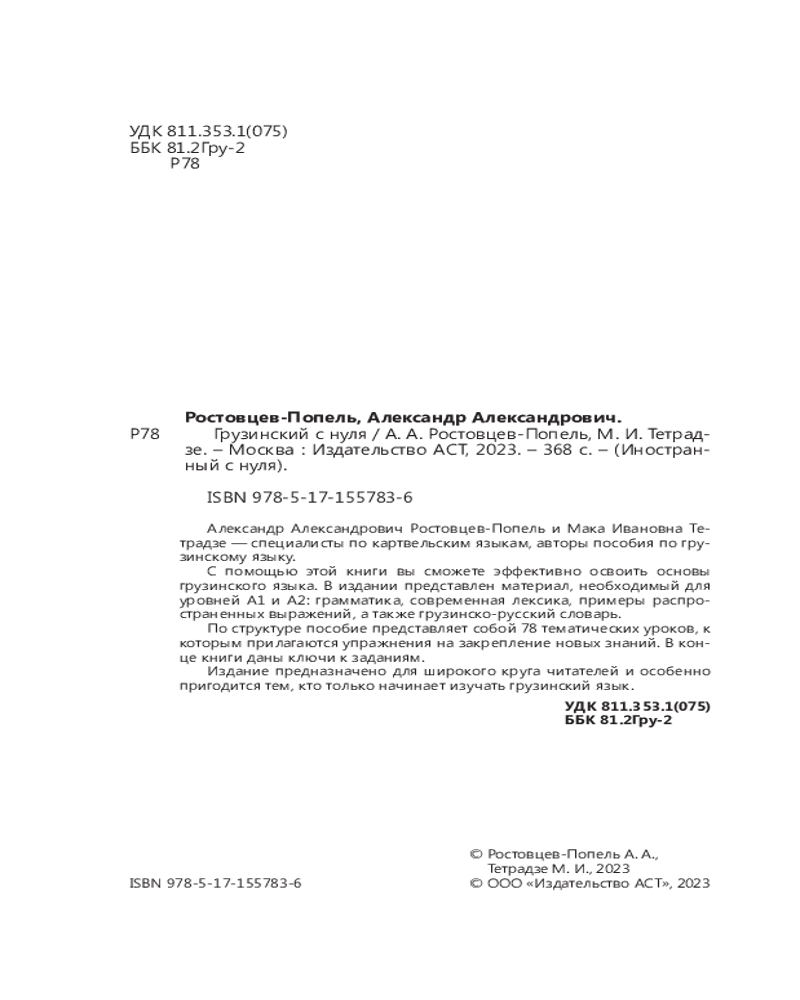 💳 Оплатить за товар можно при получении 🇰🇿 Есть бесплатная доставка по Казахстану от 1 дня 🎁 Копите бонусы с каждой покупки Серия: Иностранный с нуля Александр Александрович Ростовцев-Попель и Мака Ивановна Тетрадзе — специалисты по картвельским языкам, авторы пособия по грузинскому языку. |