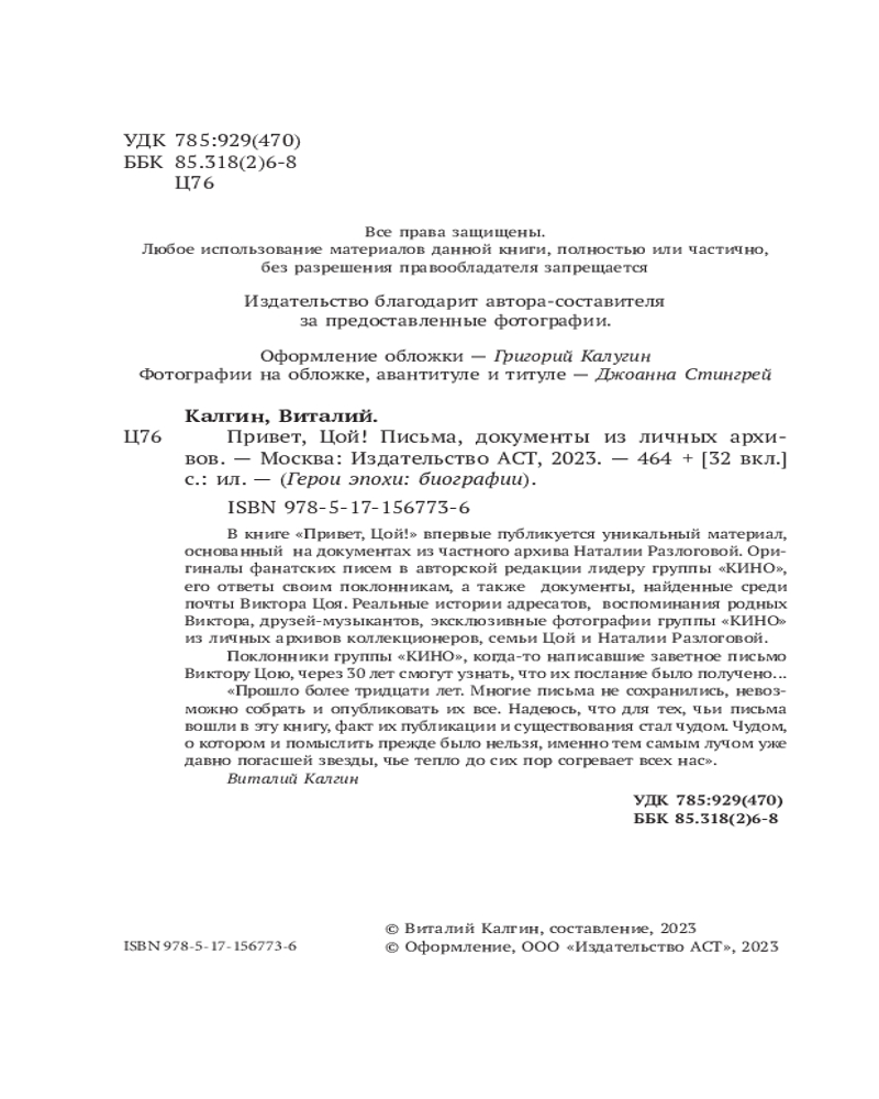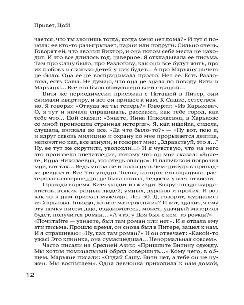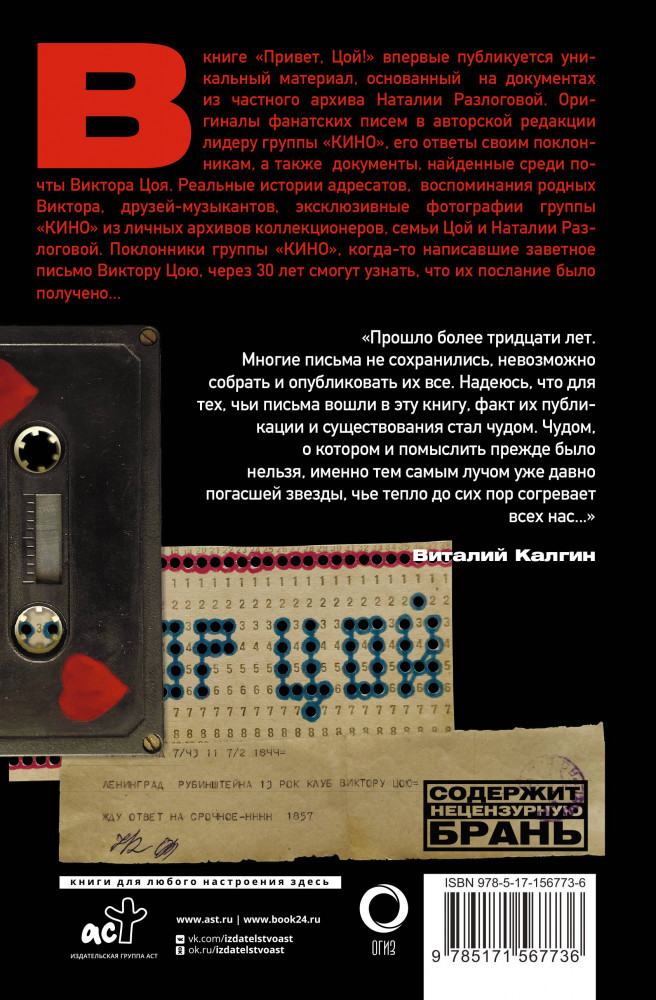 Привет, Цой! Письма, документы из личных архивовВ данный момент этот товар отсутствует в продаже. Возможно, у нас найдется аналогичный или похожий товар здесь. Серия: Герои эпохи: биографии В книге «Привет, Цой!» впервые публикуется уникальный материал, основанный на документах из частного архива Наталии Разлоговой. Оригиналы фанатских писем в авторской редакции лидеру группы «КИНО», его ответы своим поклонникам, а также документы, найденные среди почты Виктора Цоя. Реальные истории адресатов, воспоминания родных Виктора, друзей-музыкантов, эксклюзивные фотографии группы «КИНО» из личных архивов коллекционеров, семьи Цой и Наталии Разлоговой. |