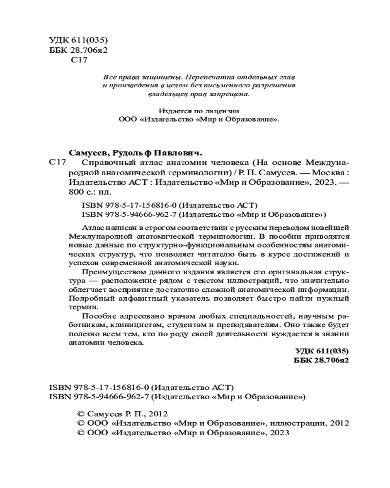 💳 Оплатить за товар можно при получении 🇰🇿 Есть бесплатная доставка по Казахстану от 1 дня 🎁 Копите бонусы с каждой покупки Серия: Самусев. Анатомия Атлас написан в строгом соответствии с русским переводом новейшей Международной анатомической терминологии. В пособии приводятся новые данные по структурно-функциональным особенностям анатомических структур, что позволяет читателю быть в курсе достижений и успехов современной анатомической науки. |