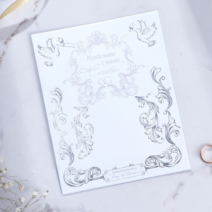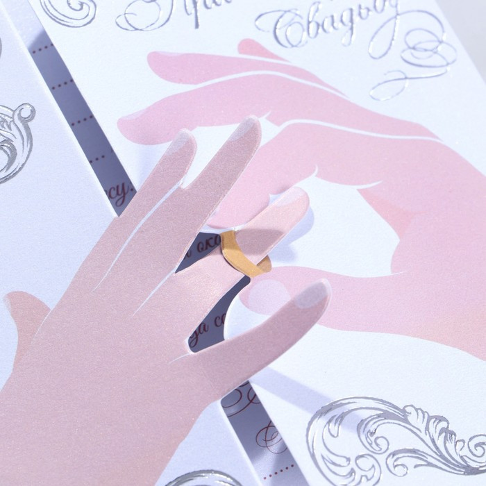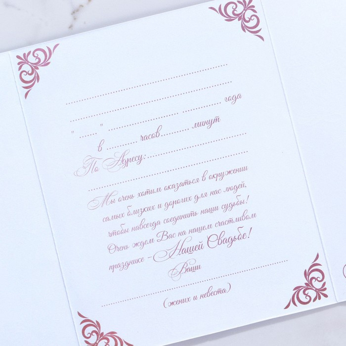 Изделие выполнено из бумаги плотностью 250 г/м² и дополнено тиснением. Это придаёт дорогой и роскошный вид. Текст приглашения содержит свободные поля для имени адресата, времени, даты и адреса проведения мероприятия. Это потрясающее приглашение достойно стать частью такого важного события в жизни, как свадьба!
