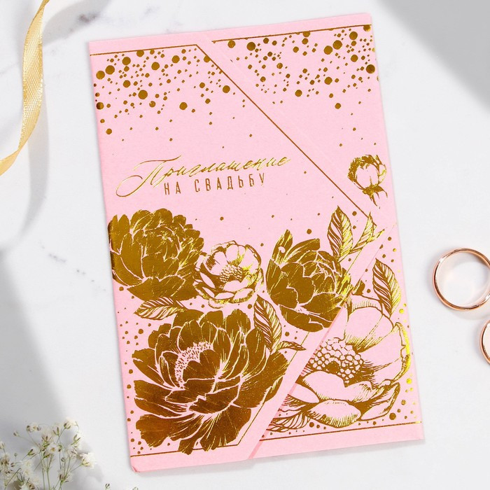 Изделие выполнено из картона плотностью 250 г/м², калька плотностью 120 г/м², конверт из офисной бумаги плотностью 120 г/м² и дополнено тиснением. Это придаёт дорогой и роскошный вид. Текст приглашения содержит свободные поля для имени адресата, времени, даты и адреса проведения мероприятия. Это потрясающее приглашение достойно стать частью такого важного события в жизни, как свадьба!