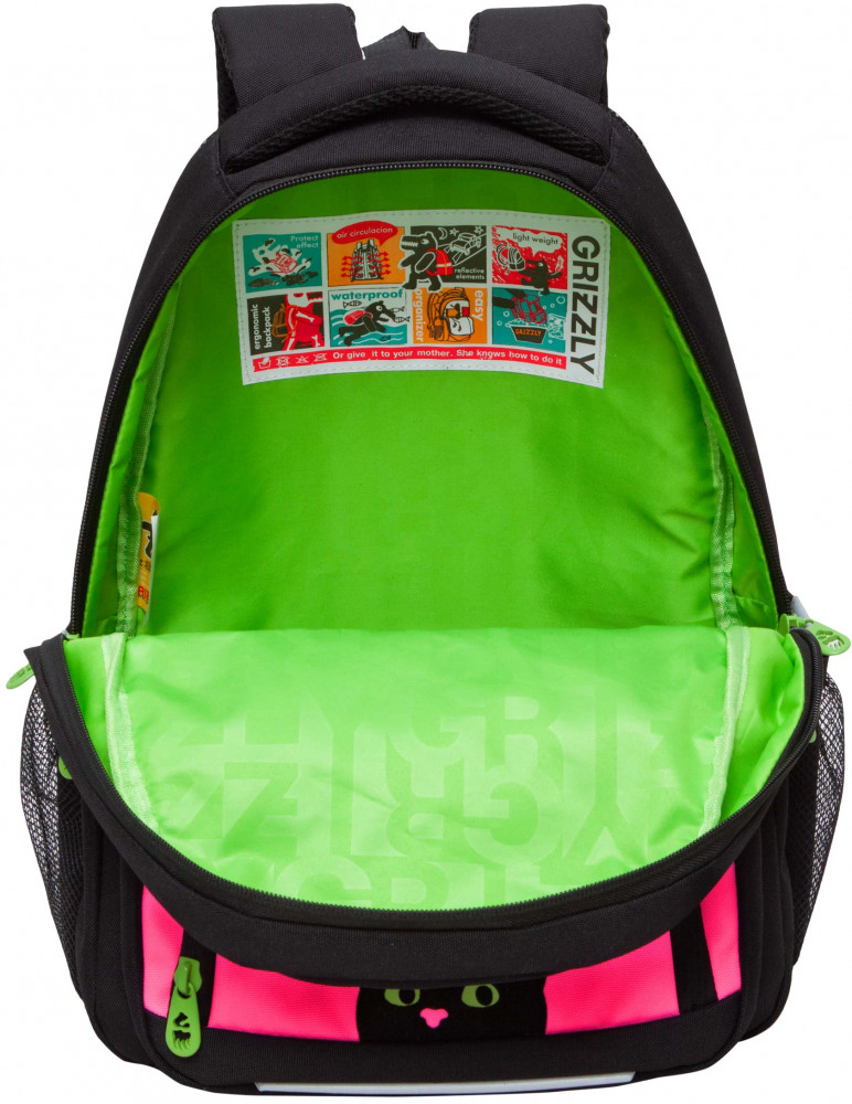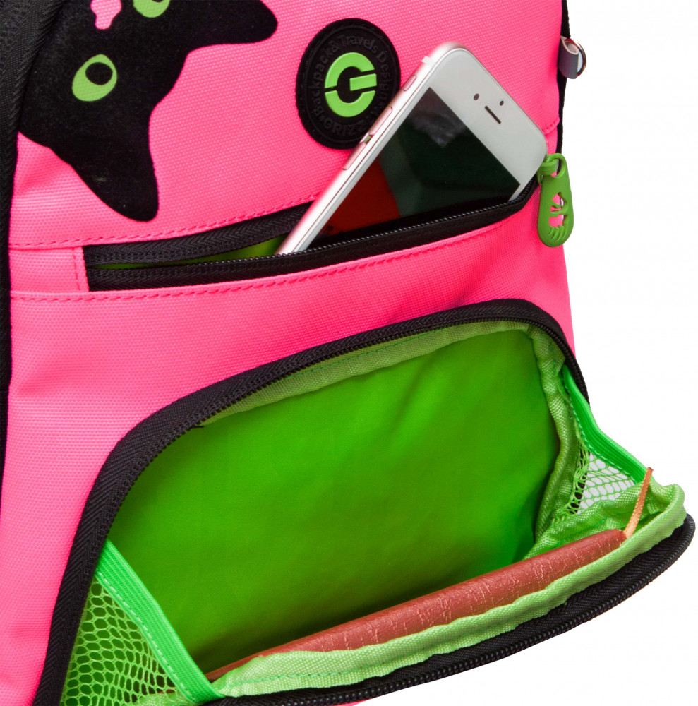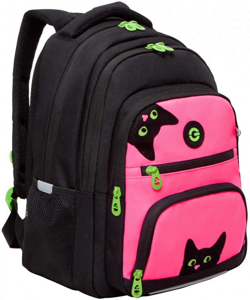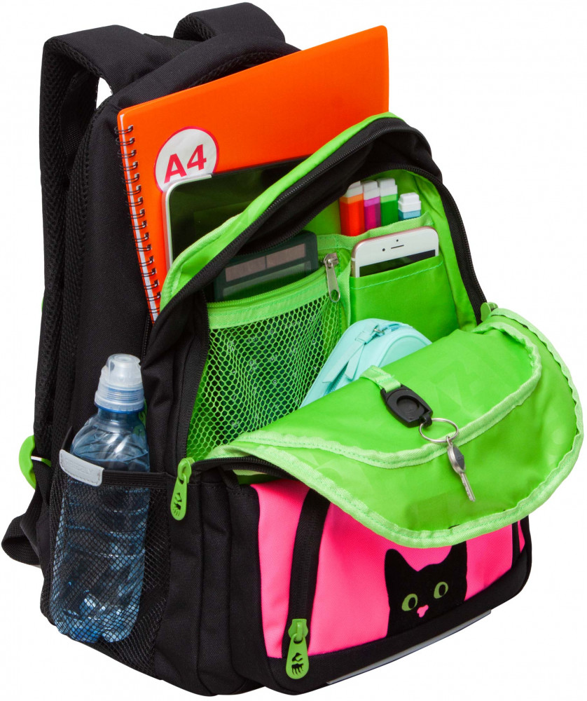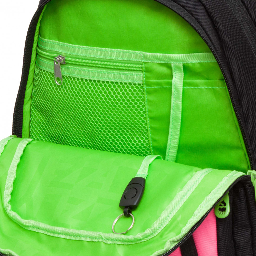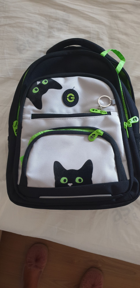 отличный рюкзак. много отделений. есть лента с карабином для присоединения ключей. небольшого размера, как раз для младших школьников. есть симпатичный пушистый брелок-помпон. 5 отделений разного размера на молнии плюс два небольших боковых сетчатых кармашков.