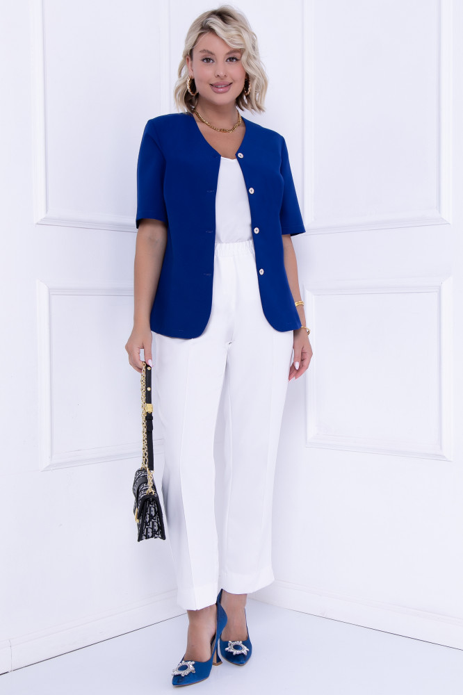 Жакет выполнен по замечательной выкройки.Мне очень тесно сошлась нижняя пуговица, поэтому возврат. Ткань такая как я хотела.Качество на высоте.