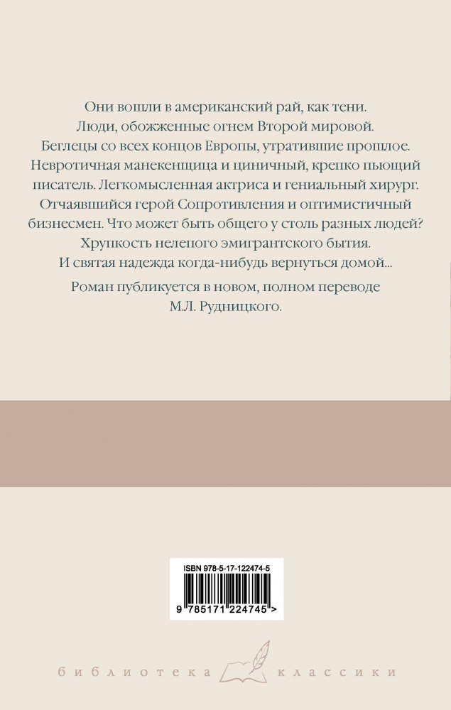 💳 Оплатить за товар можно при получении 🇰🇿 Есть бесплатная доставка по Казахстану от 1 дня 🎁 Копите бонусы с каждой покупки Серия: Библиотека классики Они вошли в американский рай, как тени. Люди, обожженные огнем Второй мировой. Беглецы со всех концов Европы, утратившие прошлое. Невротичная манекенщица и циничный, крепко пьющий писатель. Легкомысленная актриса и гениальный хирург. Отчаявшийся герой Сопротивления и оптимистичный бизнесмен. Что может быть общего у столь разных людей? Хрупкость нелепого эмигрантского бытия. И святая надежда когда-нибудь вернуться домой... |