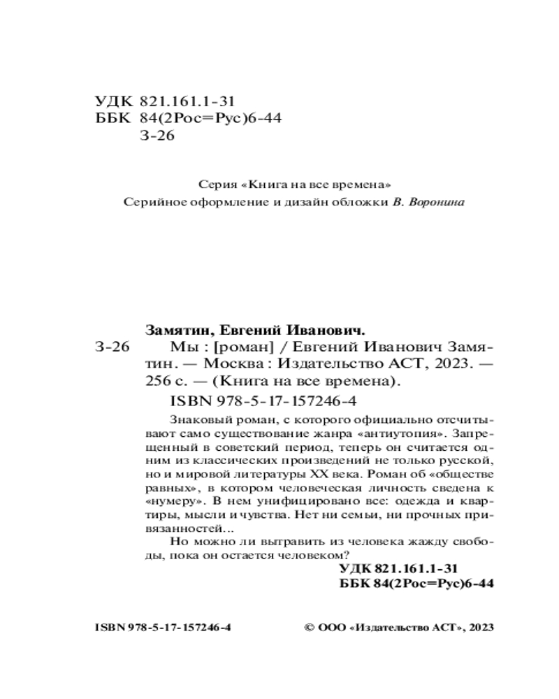 Мыкачество цена размер интересная В данный момент этот товар отсутствует в продаже. Возможно, у нас найдется аналогичный или похожий товар здесь. Серия: Книга на все времена (нов/м) «Мы» — знаменитое произведение от родоначальника жанра антиутопии Евгения Замятина. Это издание также содержит повесть «Бич Божий», сказки и рассказы 1914–1935 гг. |