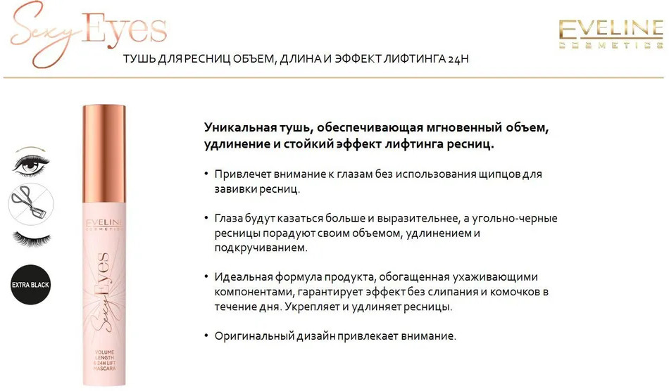 Eveline Cosmetics Тушь для ресниц «Sexy Eyes», оттенок Extra blackподнимает не осыпается неудобная щётка сложно наносится В данный момент этот товар отсутствует в продаже. Возможно, у нас найдется аналогичный или похожий товар здесь. Уникальная тушь, обеспечивающая мгновенный объем, удлинение и стойкий эффект лифтинга ресниц. Привлечет внимание к глазам без использования щипцов для завивки ресниц. Глаза будут казаться больше и выразительнее, а угольно-черные ресницы порадуют своим объемом, удлинением и подкручиванием. Идеальная формула продукта, обогащенная ухаживающими компонентами, гарантирует эффект без слипания и комочков в течение дня. Укрепляет и удлиняет ресницы. Оригинальный дизайн привлекает внимание. |