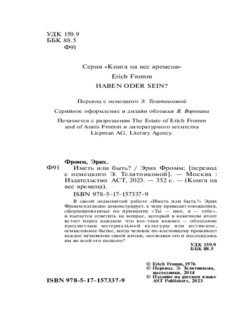 Серия: Книга на все времена (нов/м) Исследуйте свои истинные цели вместе с известным психоаналитиком Эрихом Фроммом. Попробуйте проникнуться его рассуждениями о смысле жизни и ценностях. Откройте для себя силу настоящего счастья.В своем знаменитом произведении «Иметь или быть?» авторитетный психолог и философ Эрих Фромм изучает проблему отношений, основанных на принципе «Ты — мне, я — тебе», и показывает, чем это в итоге может обернуться. Фромм задается фундаментальным вопросом: что действительно важно — обладание материальными благами или искреннее яркое осознанное бытие?Книга является одним из наиболее значимых произведений Эриха Фромма, мирового авторитета в области психологии, философии и социологии. Его работы переведены на множество языков и вдохновляют читателей по всему миру. |