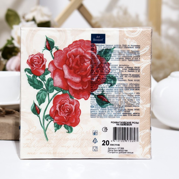 Art Bouquet Набор салфеток бумажных «Романтические розы на бежевом»В данный момент этот товар отсутствует в продаже. Возможно, у нас найдется аналогичный или похожий товар здесь. Бумажные салфетки станут неотъемлемым атрибутом Вашего стола. Изделия выполнены из первичной 100 % целлюлозы премиального качества, отличаются изысканным внешним видом. |