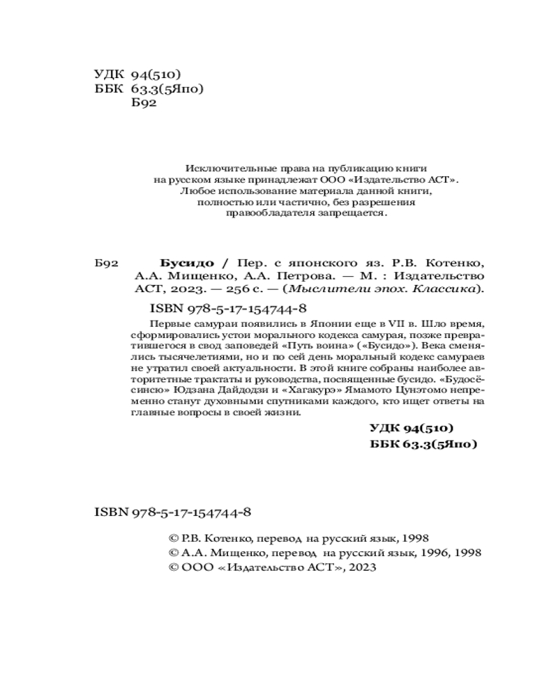 БусидоДайдодзи Юдзан , Ямамото Цунэтомо В данный момент этот товар отсутствует в продаже. Возможно, у нас найдется аналогичный или похожий товар здесь. Серия: Мыслители эпох. Классика Первые самураи появились в Японии еще в VII в. Шло время, cформировались устои морального кодекса самурая, позже превратившегося в свод заповедей «Путь воина» («Бусидо»). Века сменялись тысячелетиями, но и по сей день моральный кодекс самураев не утратил своей актуальности. В этой книге собраны наиболее авторитетные трактаты и руководства, посвященные бусидо. «Будосёсинсю» Юдзана Дайдодзи и «Хагакурэ» Ямамото Цунэтомо непременно станут духовными спутниками каждого, кто ищет ответы на главные вопросы в своей жизни. |