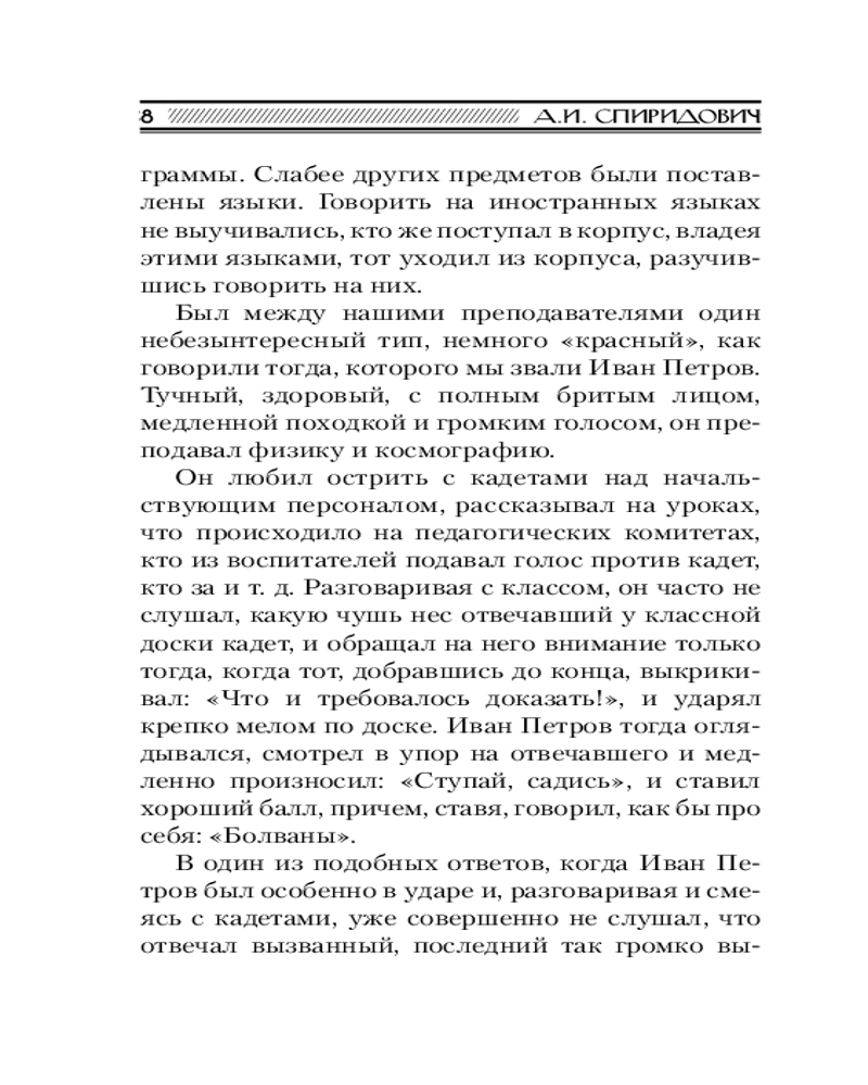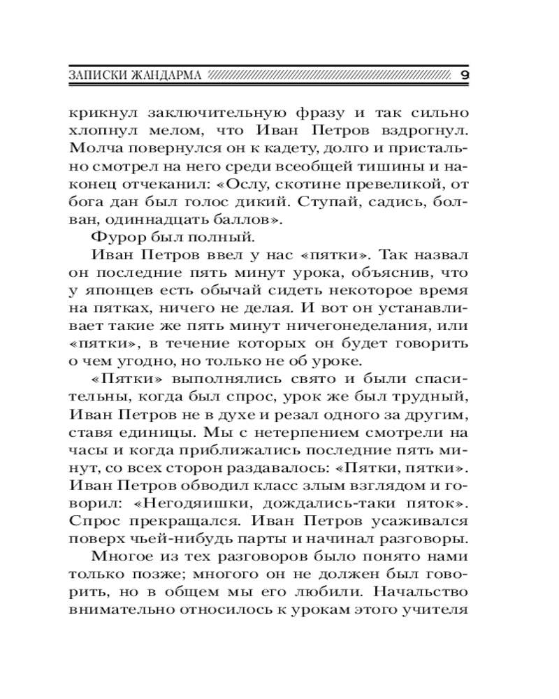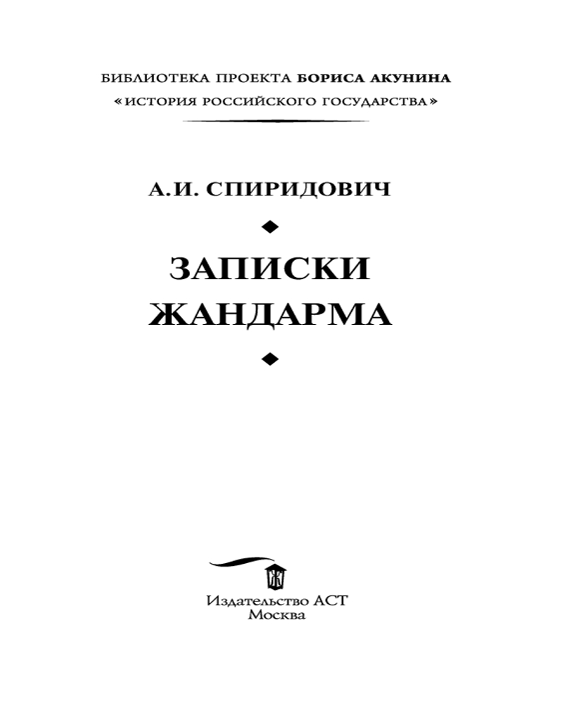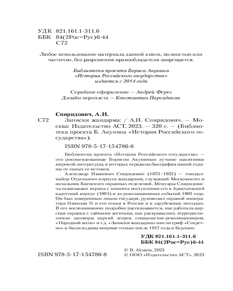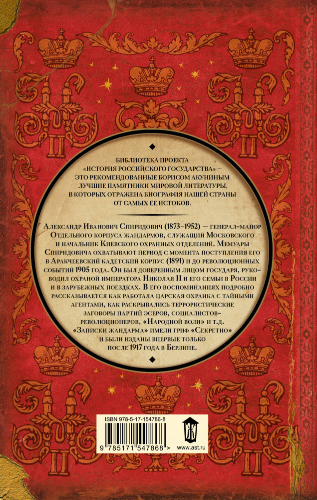 Записки жандармаВ данный момент этот товар отсутствует в продаже. Возможно, у нас найдется аналогичный или похожий товар здесь. Серия: Библиотека проекта Бориса Акунина ИРГ Библиотека проекта «История Российского государства» — это рекомендованные Борисом Акуниным лучшие памятники мировой литературы, в которых отражена биография нашей стра- ны от самых ее истоков. Александр Иванович Спиридович (1873-1952) — генерал- майор Отдельного корпуса жандармов, служащий Московского и начальник Киевского охранных отделений. Мемуары Спиридови- ча охватывают период с момента поступления его в Аракчеевский кадетский корпус (1891) и до революционных событий 1905 года. Он был доверенным лицом государя, руководил охраной импера- тора Николая II и его семьи в России и в зарубежных поездках. В его воспоминаниях подробно рассказывается, как работала цар- ская охранка с тайными агентами, как раскрывались террористи- ческие заговоры партий эсеров, социалистов-революционеров, «Народной воли» и т.д. «Записки жандарма» имели гриф «Секрет- но» и были изданы впервые только после 1917 года в Берлине. |