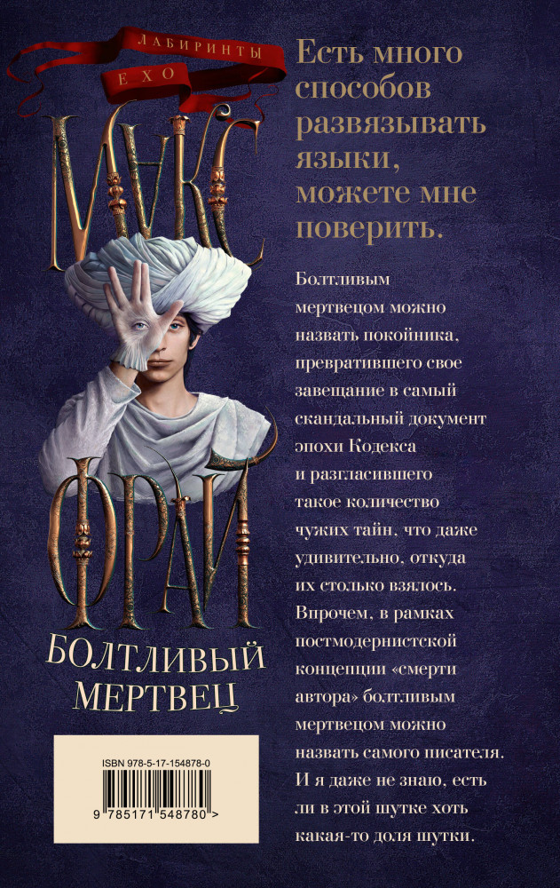 В данный момент этот товар отсутствует в продаже. Возможно, у нас найдется аналогичный или похожий товар здесь. Серия: Лабиринты Ехо (илл. Ферез) Болтливым мертвецом можно назвать покойника, превратившего своё завещание в самый скандальный документ эпохи Кодекса и разгласившего такое количество чужих тайн, что даже удивительно, откуда их столько взялось. Впрочем, в рамках постмодернистской концепции «смерти автора», болтливым мертвецом можно назвать самого писателя. И я даже не знаю, есть ли в этой шутке хоть какая-то доля шутки. |