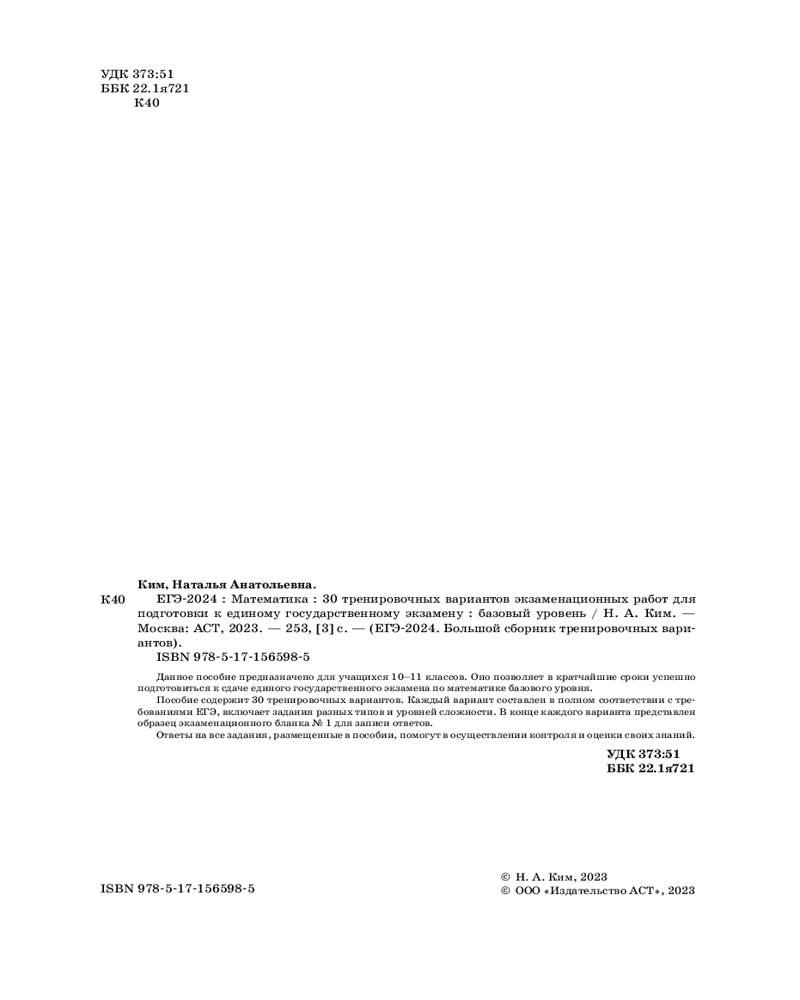 ЕГЭ-2024. Математика. 30 тренировочных вариантов экзаменационных работ для подготовки к единому государственному экзамену. Базовый уровеньВ данный момент этот товар отсутствует в продаже. Возможно, у нас найдется аналогичный или похожий товар здесь. Серия: ЕГЭ-2024. Большой сборник тренировочных вариантов Данное пособие предназначено для учащихся 10–11 классов. Оно позволяет в кратчайшие сроки успешно подготовиться к сдаче единого государственного экзамена по математике базового уровня в 2024 году. |