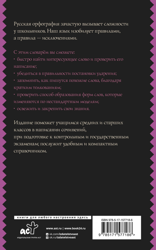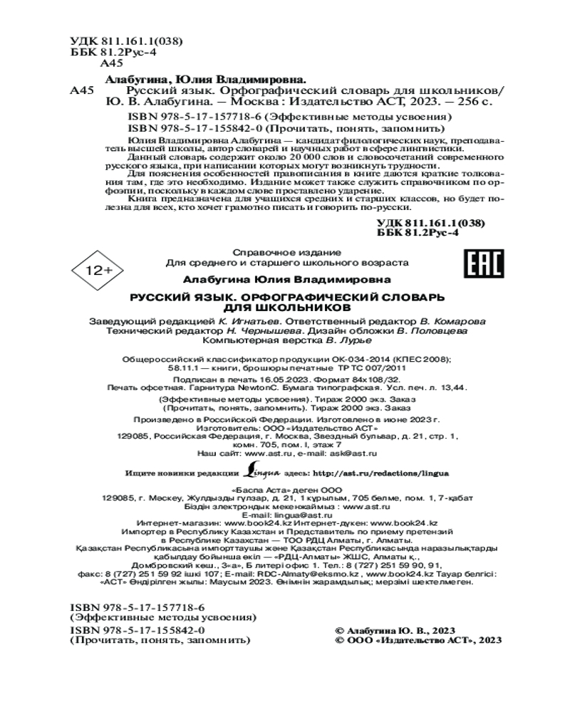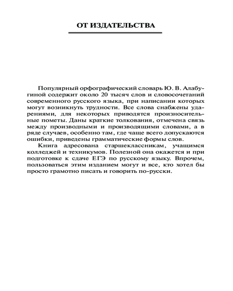 Русский язык. Орфографический словарь для школьниковВ данный момент этот товар отсутствует в продаже. Возможно, у нас найдется аналогичный или похожий товар здесь. Серия: Эффективные методы усвоения Юлия Владимировна Алабугина — кандидат филологических наук, преподаватель высшей школы, автор словарей и научных работ в сфере лингвистики. Данный словарь содержит около 20 000 слов и словосочетаний современного русского языка, при написании которых могут возникнуть трудности. Для пояснения особенностей правописания в книге даются краткие толкования там, где это необходимо. Издание может также служить справочником по орфоэпии, поскольку в каждом слове проставлено ударение. |