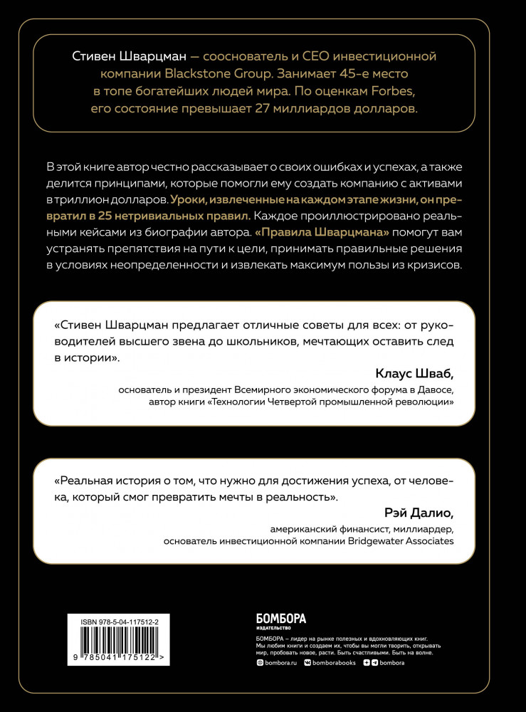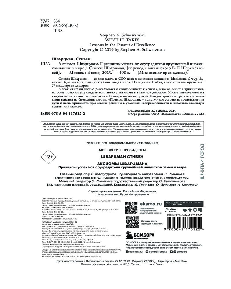 💳 Оплатить за товар можно при получении 🇰🇿 Есть бесплатная доставка по Казахстану от 1 дня 🎁 Копите бонусы с каждой покупки Серия: Мне звонят президенты В этой книге он честно рассказывает о своих ошибках и успехах, а также делится принципами, которые помогли ему создать компанию с активами в триллион долларов. Уроки, извлеченные на каждом этапе жизни, он превратил в 25 нетривиальных правил. Каждое проиллюстрировано реальными кейсами из биографии автора. «Правила Шварцмана» помогут вам устранять препятствия на пути к цели, принимать правильные решения в условиях неопределенности и извлекать максимум пользы из кризисов. |