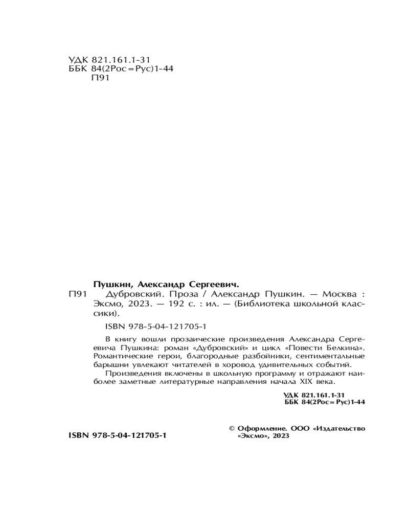 Но перевернув последнюю страницу романа, мы по-прежнему остаёмся в прекрасном, романтичном мире пушкинской прозы. Перед нами «Повести Белкина» — уникальный цикл из пяти произведений, вобравший в себя самые популярные литературные направления: от романтизма до готической прозы. Роман «Дубровский» и цикл «Повести Белкина» включены в школьную программу по литературе. |