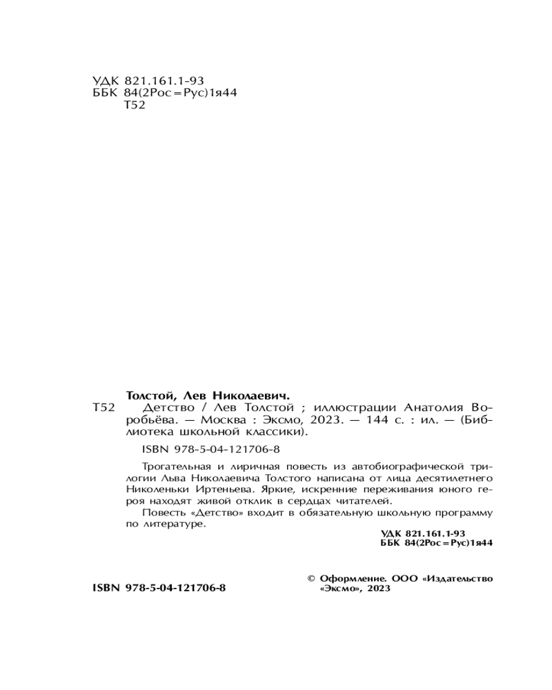 💳 Оплатить за товар можно при получении 🇰🇿 Есть бесплатная доставка по Казахстану от 1 дня 🎁 Копите бонусы с каждой покупки Серия: Библиотека школьной классики Нежная и лиричная, наполненная любовью и милосердием автобиографическая повесть Льва Николаевича Толстого «Детство» — одна из самых востребованных книг о лучшей поре жизни. Она написана от первого лица так искренне и психологически безупречно, что у читателей возникает чувство дружеского разговора с главным героем, десятилетним мальчиком Николенькой Иртеньевым. В этом разговоре мы узнаём свои переживания: первые радости, первую любовь, первые горькие утраты; учимся верить, сострадать и понимать тех, кто нас окружает. «Вернутся ли когда-нибудь та свежесть, беззаботность, потребность любви и сила веры, которыми обладаешь в детстве?» Повесть «Детство» включена в школьную программу по литературе. |