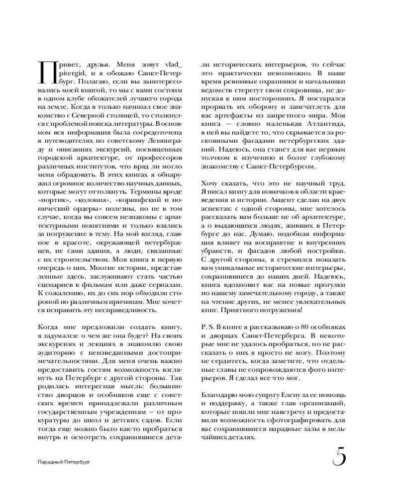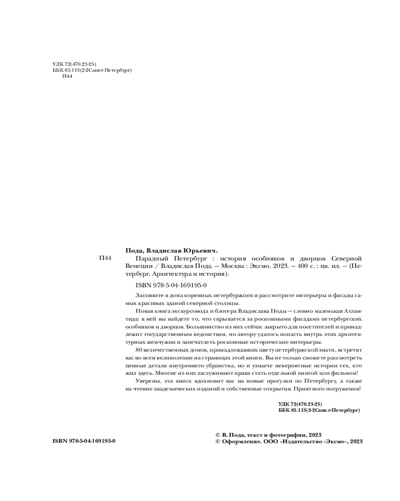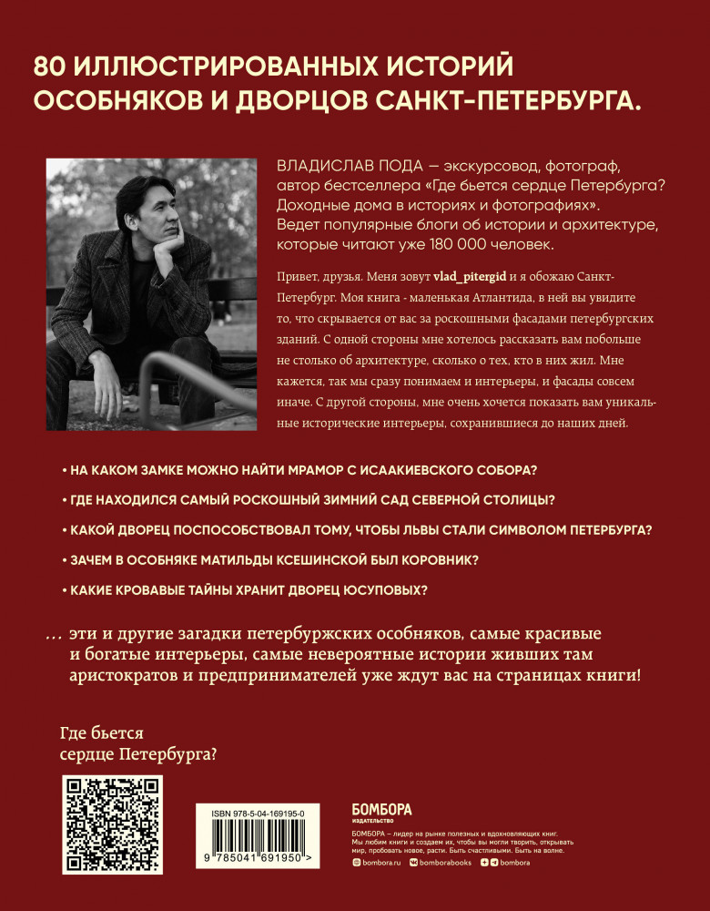 ...эти и другие загадки петербургских особняков, самые красивые и богатые интерьеры, самые невероятные истории живших там аристократов и предпринимателей уже ждут вас на страницах книги! Владислав Пода — экскурсовод, фотограф, автор бестселлера «Где бьется сердце Петербурга? Доходные дома в историях и фотографиях». Ведет популярные блоги об истории и архитектуре, которые читают уже 180 000 человек. |