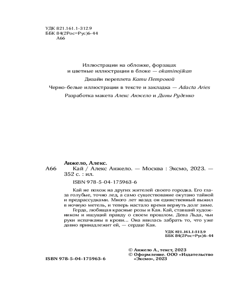 💳 Оплатить за товар можно при получении 🇰🇿 Есть бесплатная доставка по Казахстану от 1 дня 🎁 Копите бонусы с каждой покупки Серия: Young Adult. Книжный бунт. Фантастика Кай не похож на других жителей своего городка. Его глаза голубые, точно лед, а само существование окутано тайной и предрассудками. Много лет назад он единственный выжил в ночную метель, и теперь настало время вернуть долг зиме. Герда, любящая красные розы и Кая. Кай, ставший художником и ищущий правду о своем прошлом. Дева Льда, чьи руки испачканы в крови... Она явилась забрать то, что уже давно принадлежит ей — сердце Кая. |