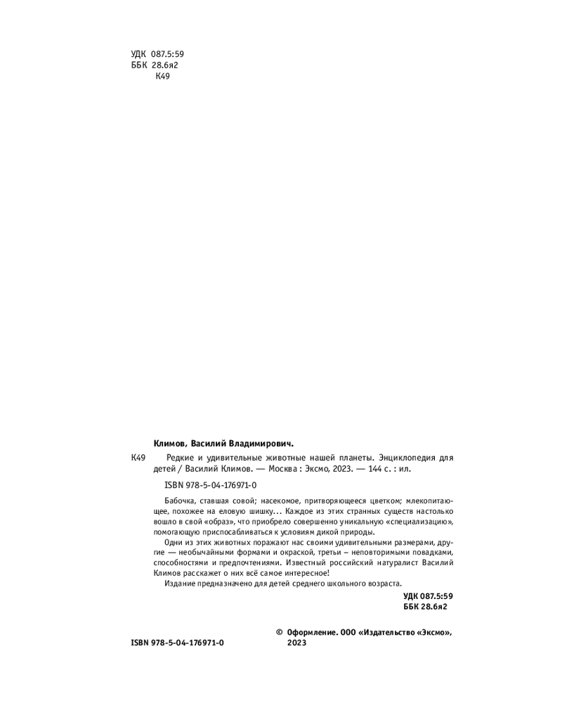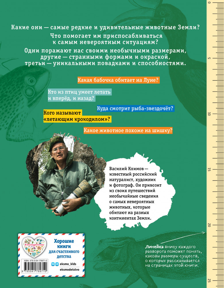 💳 Оплатить за товар можно при получении 🇰🇿 Есть бесплатная доставка по Казахстану 🎁 Копите бонусы с каждой покупки Серия: Атласы и энциклопедии Всё о редких и удивительных животных — насекомых, рыбах, рептилиях, птицах и млекопитающих — из первых рук: эта энциклопедия для детей написана известным путешественником и натуралистом Василием Климовым, долгое время работавшим в заповедниках на разных континентах планеты. Для того, чтобы увидеть одних из этих существ, придётся взять в руки лупу, других лучше рассматривать из-за полога леса, третьи настолько опасны, что к ним лучше вообще не приближаться, а четвёртые поражают своим внешним видом или повадками. Книга предназначена для детей среднего школьного возраста, но она будет интересна и взрослым, отлично подходит для изучения всей семьёй и послужит замечательным подарком! |