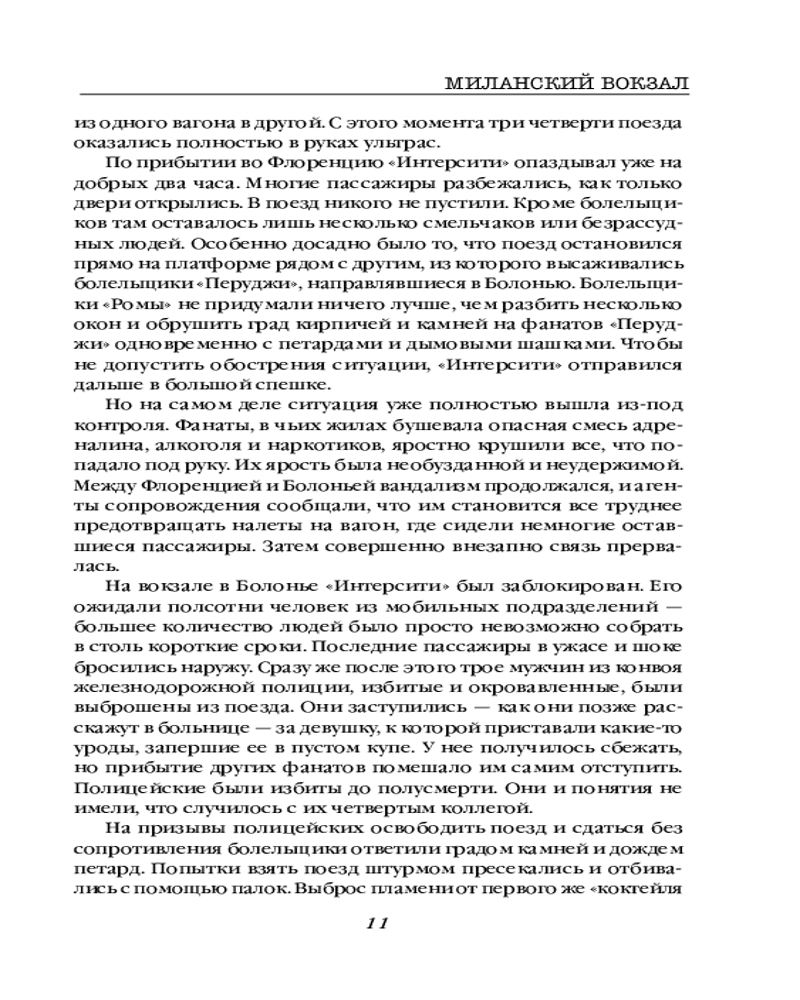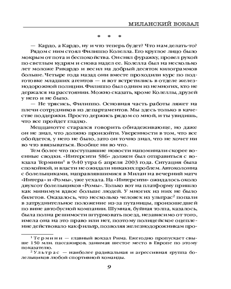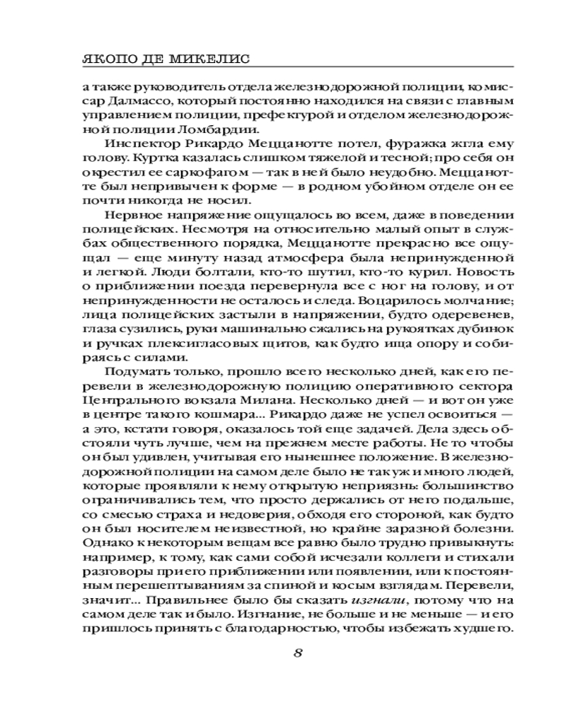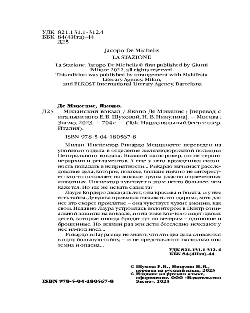 Серия: Tok. Национальный бестселлер. Италия Милан. Инспектор Рикардо Меццанотте переведен из убойного отдела в отделение железнодорожной полиции Центрального вокзала. Бывший панк-рокер, он не терпит иерархии и регламентов. А еще у него врожденная склонность попадать в неприятности... Рикардо начинает расследование дела, которое, похоже, больше никого не интересует: кто-то оставляет на вокзале трупы ужасно изувеченных животных. Инспектор чувствует в этом нечто большее, чем кажется. Но где же искать садиста? |
