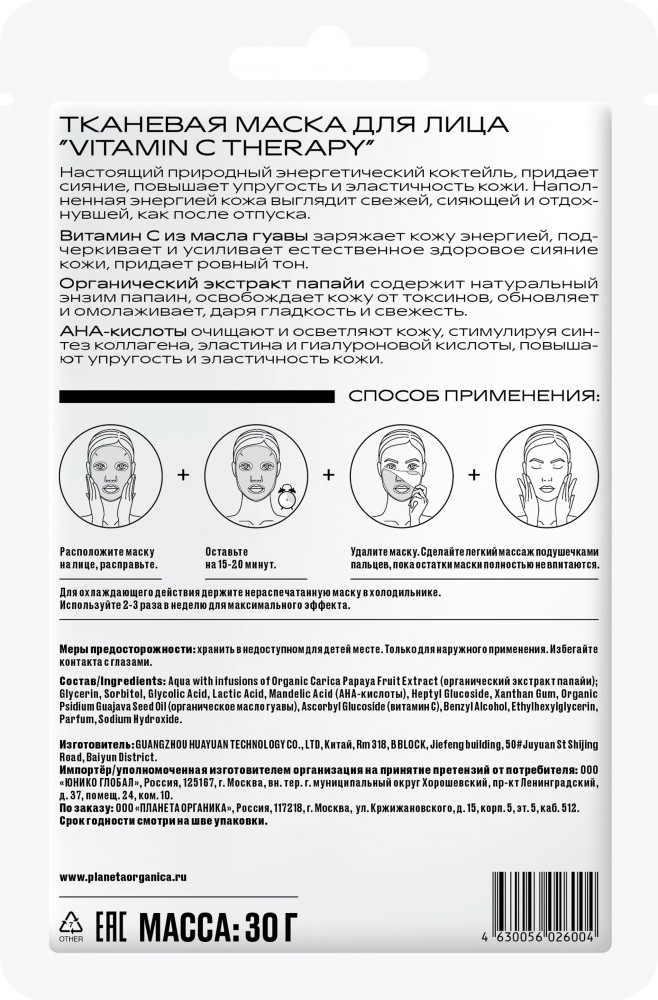 Planeta Organica Маска для лица тканевая кислотная «Vitamin С Therapy»защитная мембрана много сыворотки увлажнение В данный момент этот товар отсутствует в продаже. Возможно, у нас найдется аналогичный или похожий товар здесь. Настоящий природный энергетический коктейль, придает сияние, повышает упругость и эластичность кожи. Наполненная энергией кожа выглядит свежей, сияющей и отдохнувшей, как после отпуска. Витамин С из масла гуавы заряжает кожу энергией, подчеркивает и усиливает естественное здоровое сияние кожи, придает ровный тон. Органический экстракт папайи содержит натуральный энзим папаин, освобождает кожу от токсинов, обновляет и омолаживает, даря гладкость и свежесть. AHA-кислоты очищают и осветляют кожу, стимулируя синтез коллагена, эластина и гиалуроновой кислоты, повышают упругость и эластичность кожи. |