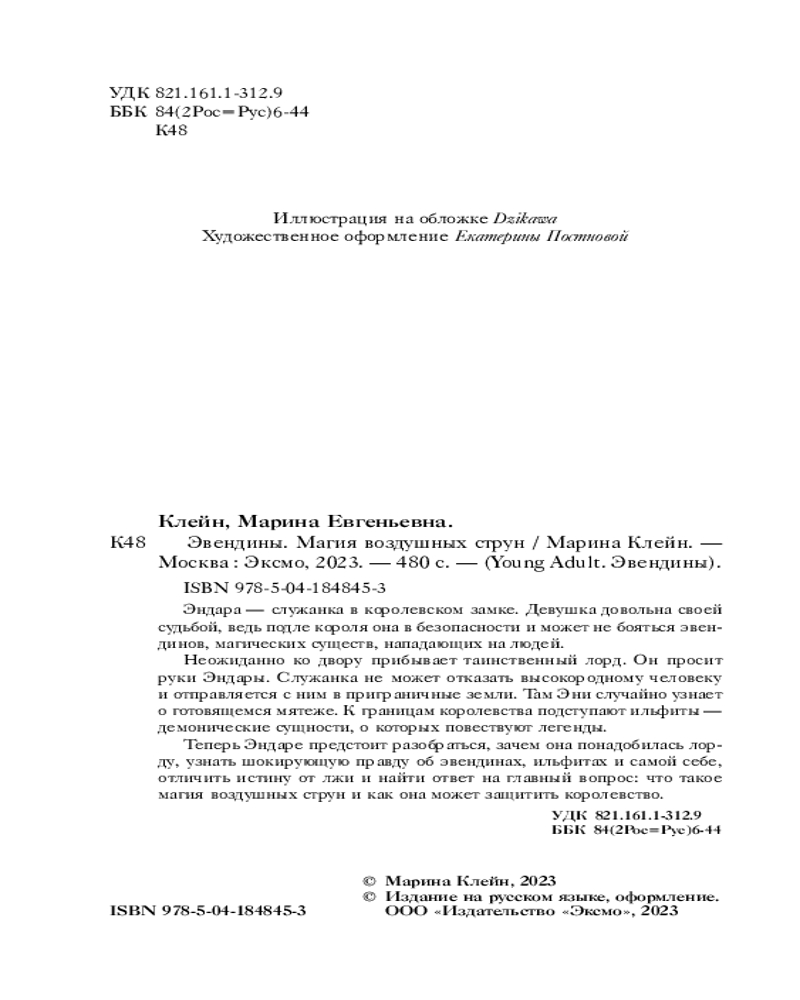 В данный момент этот товар отсутствует в продаже. Возможно, у нас найдется аналогичный или похожий товар здесь. Серия: Young Adult. Эвендины «Магия воздушных струн» — дебютный роман российской писательницы Марины Клейн, ставшей лауреатом премии «Рукопись года». Первая книга серии «Эвендины», магического фэнтези с уникальным проработанным миром.