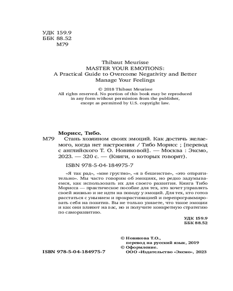 💳 Оплатить за товар можно при получении 🇰🇿 Есть бесплатная доставка по Казахстану от 1 дня 🎁 Копите бонусы с каждой покупки Серия: Книги, о которых говорят Как часто вы ловили себя на мысли, что «недостаточно хороши» для того, чтобы попросить повышение, открыть свой бизнес или уйти от человека, который вас не ценит. Стресс, плохое настроение и прокрастинация — вот три проблемы, с которыми постоянно сталкивается современный человек. Просто остановитесь на секунду и спросите себя: «Что я сейчас чувствую?» Коуч Тибо Морисс убежден, что именно эмоции определяют качество жизни и могут сделать ее невыносимой или волшебной. В книге вы найдете упражнения на каждый день, которые помогут превратить сожаления в возможности. |