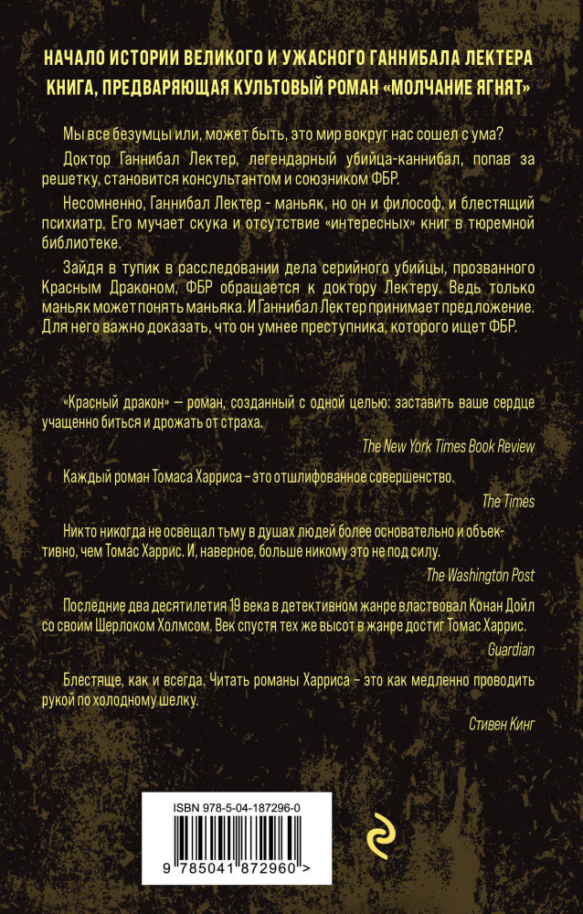 💳 Оплатить за товар можно при получении 🇰🇿 Есть бесплатная доставка по Казахстану от 1 дня 🎁 Копите бонусы с каждой покупки Серия: Криминальная классика (обложка) Роман, предваряющий культовую книгу «Молчание ягнят». Знаменитая экранизация с Энтони Хопкинсом в главной роли. Легендарному Ганнибалу Лектеру придется вступить в интеллектуальную схватку с другим серийным убийцей — Красным драконом. Какую изощренную игру решил затеять доктор, решив помочь ФБР? |