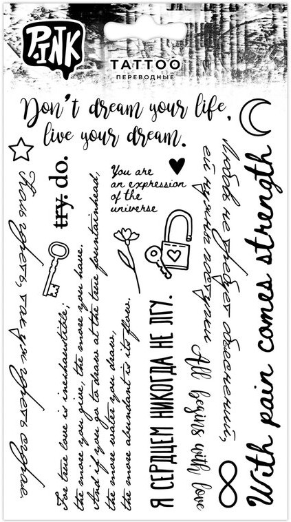 Pink Наклейки-тату переводные «Большие надписи-2»В данный момент этот товар отсутствует в продаже. Возможно, у нас найдется аналогичный или похожий товар здесь. Наклейки-тату переводные — это самая универсальная татуировка, только от Вас зависит, куда Вы её переведете. Универсальный размер данной тату и неповторимый эскиз позволяет украсить любую часть вашего тела. Возможность сочетать несколько эскизов в одной стилистике позволяет собрать индивидуальный сет на вашем теле и удивить всех вашим образом. |