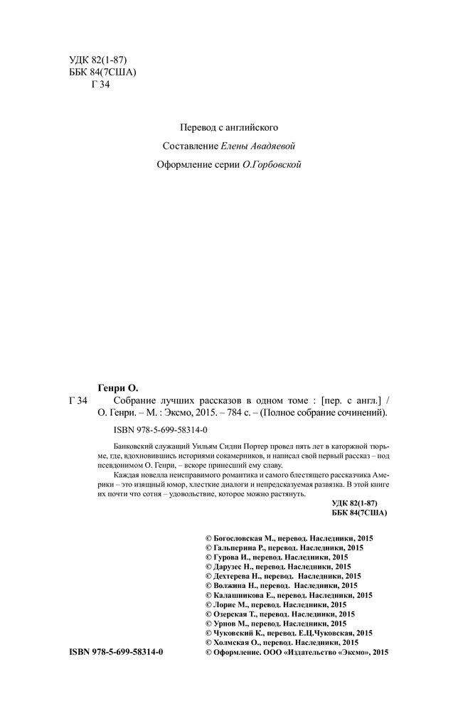 Собрание лучших рассказов в одном томеУильям Сидни Портер (О. Генри) В данный момент этот товар отсутствует в продаже. Возможно, у нас найдется аналогичный или похожий товар здесь. Серия: Полное собрание сочинений Банковский служащий Уильям Сидни Портер провел пять лет в каторжной тюрьме, где, вдохновившись историями сокамерников, и написал свой первый рассказ — под псевдонимом О. Генри, вскоре принесшим ему славу. |