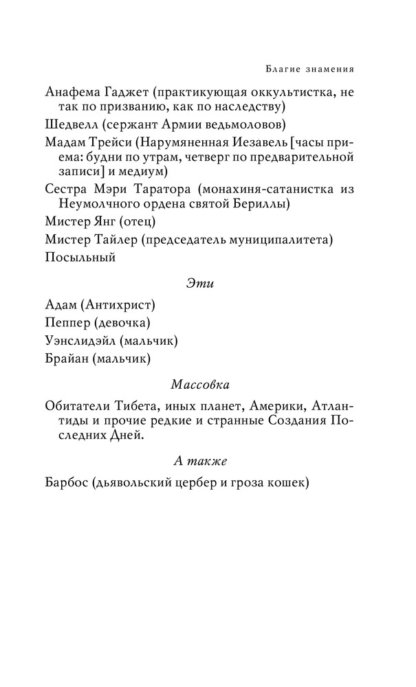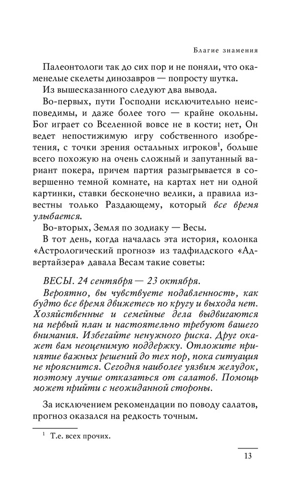 Благие знаменияВ данный момент этот товар отсутствует в продаже. Возможно, у нас найдется аналогичный или похожий товар здесь. Серия: Терри Пратчетт Говорят, мир закончится в субботу. А именно, в следующую субботу. Незадолго до ужина. К несчастью, по ошибке Мэри Тараторы, сестры Неумолчного ордена, Антихриста не пристроили в нужное место. Четыре всадника Апокалипсиса оседлали мотоциклы. А представители Верхнего и Нижнего Миров сочли, что им очень симпатичен человеческий род… |