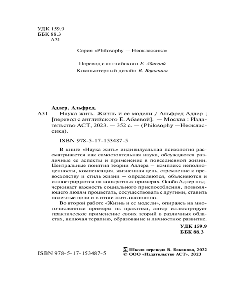 В данный момент этот товар отсутствует в продаже. Возможно, у нас найдется аналогичный или похожий товар здесь. Серия: Philosophy — неоклассика В книге «Наука жить» индивидуальная психология рассматривается как самостоятельная наука, обсуждаются различные ее аспекты и применение в повседневной жизни. Центральные понятия теории Адлера — комплекс неполноценности, компенсация, жизненная цель, стремление к превосходству и стиль жизни — определяются, объясняются и иллюстрируются на конкретных примерах. Особо Адлер подчеркивает важность социального приспособления, позволяющего людям процветать, сосуществовать с другими, ставить полезные цели и в итоге жить осознанно.