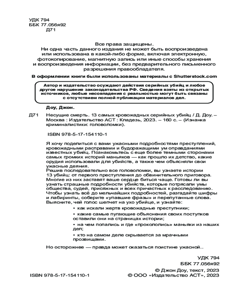 💳 Оплатить за товар можно при получении 🇰🇿 Есть бесплатная доставка по Казахстану от 1 дня 🎁 Копите бонусы с каждой покупки Серия: Изнанка криминалистики: головоломки Я хочу поделиться с вами ужасными подробностями преступлений, кровожадными расправами и будоражащими ум оправданиями известных убийц. Познакомьтесь с еще более темными сторонами самых громких историй маньяков — как прошло их детство, какие орудия использовали для убийств, а также чем объясняли свои ужасные деяния. |