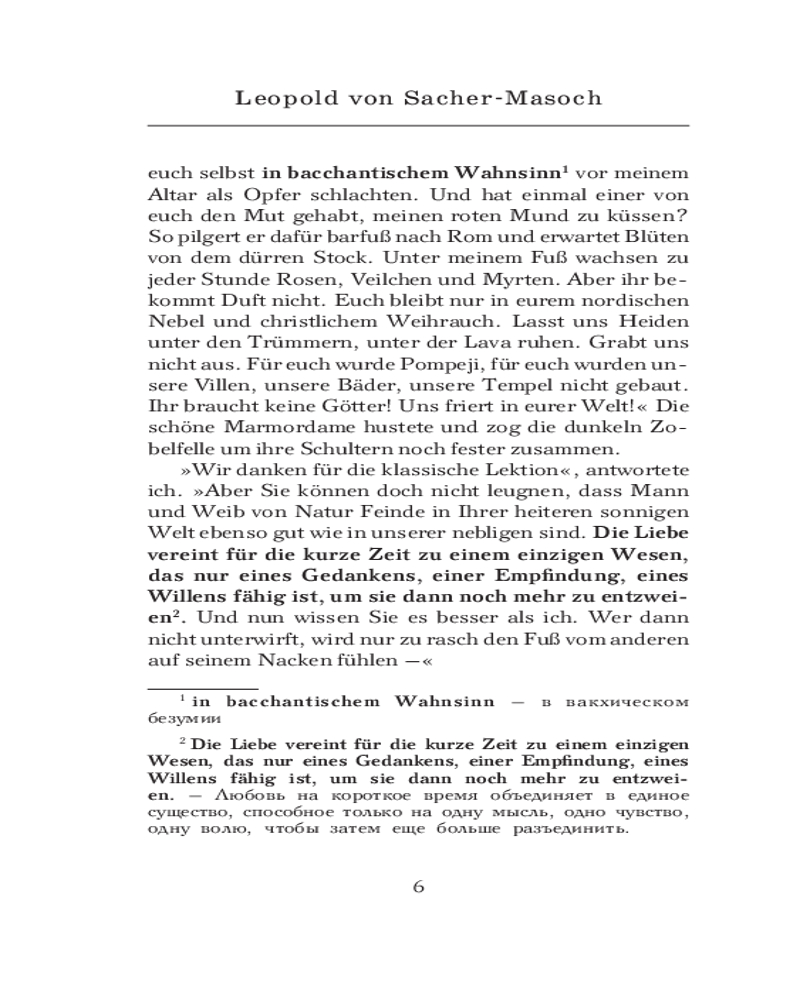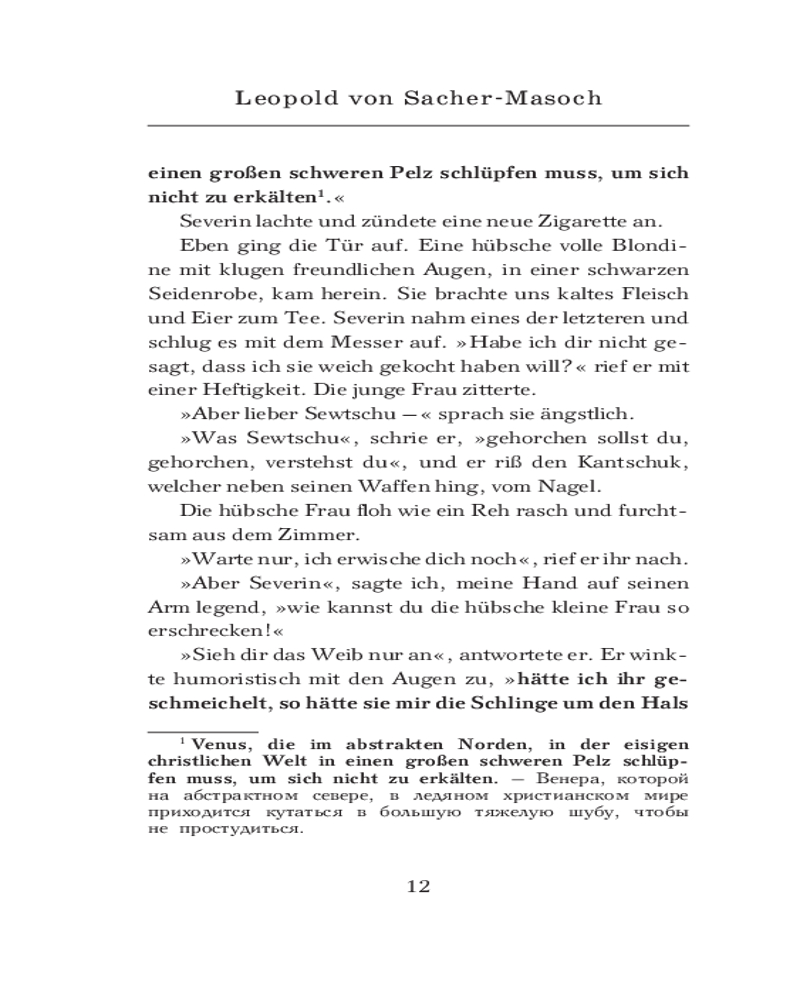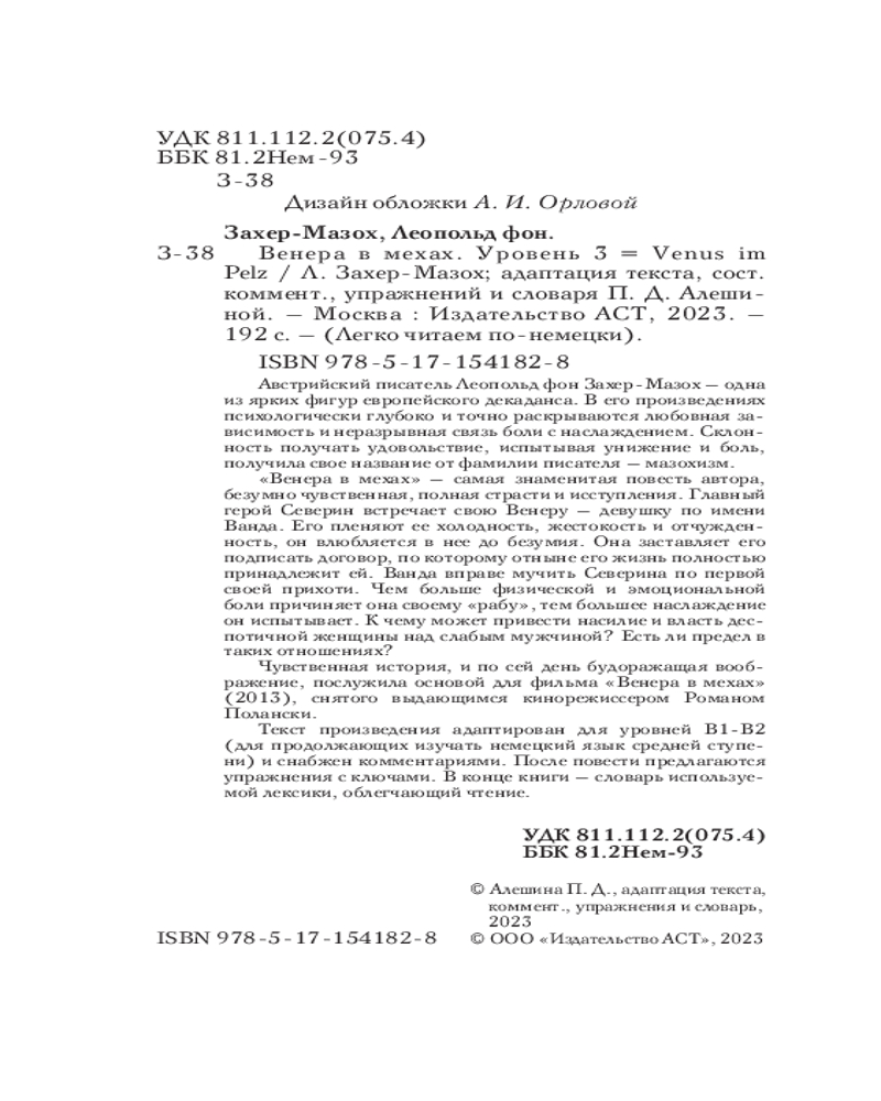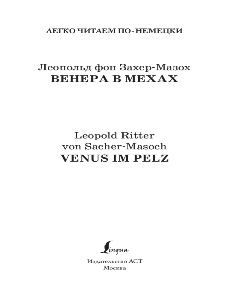 💳 Оплатить за товар можно при получении 🇰🇿 Есть бесплатная доставка по Казахстану от 1 дня 🎁 Копите бонусы с каждой покупки Серия: Легко читаем по-немецки Австрийский писатель Леопольд фон Захер-Мазох — одна из ярких фигур европейского декаданса. В его произведениях психологически глубоко и точно раскрываются любовная зависимость и неразрывная связь боли с наслаждением. Склонность получать удовольствие, испытывая унижение и боль, получила свое название от фамилии писателя — мазохизм. |