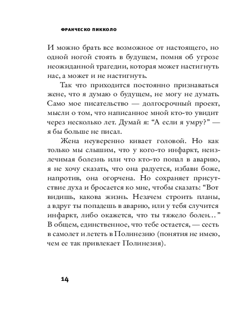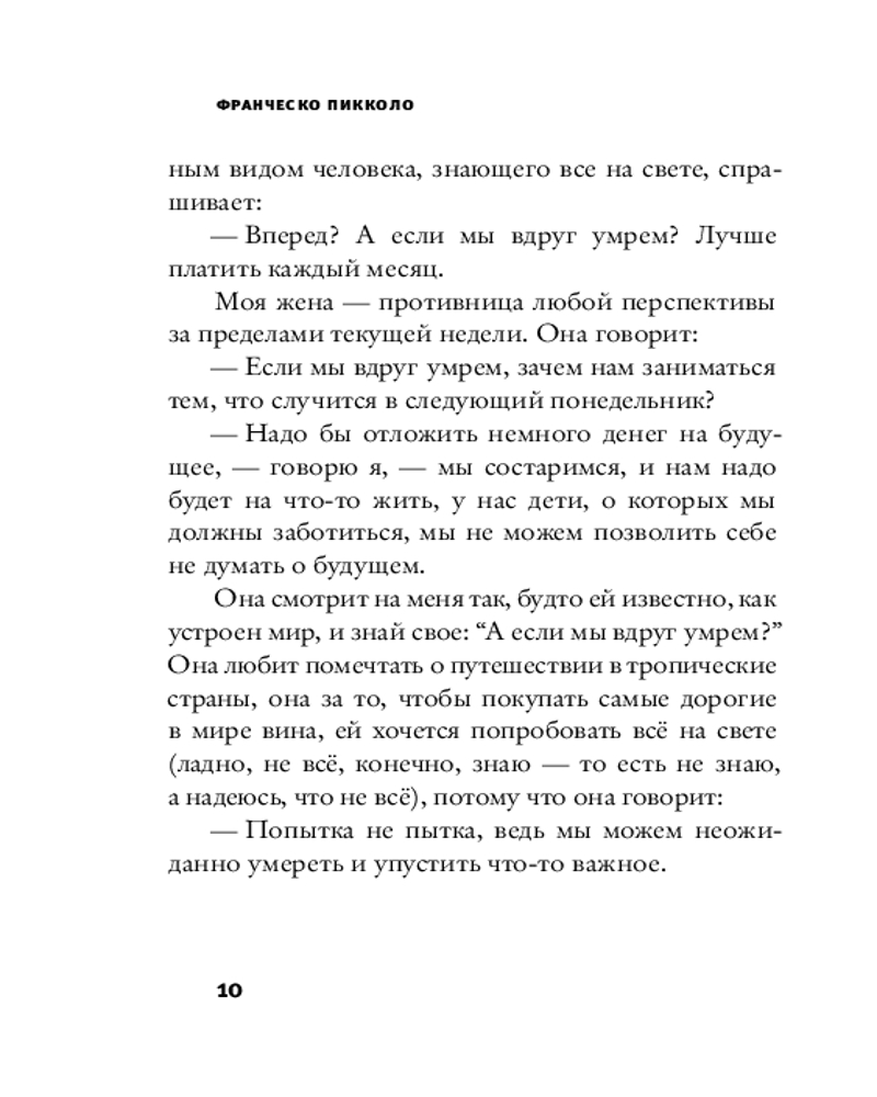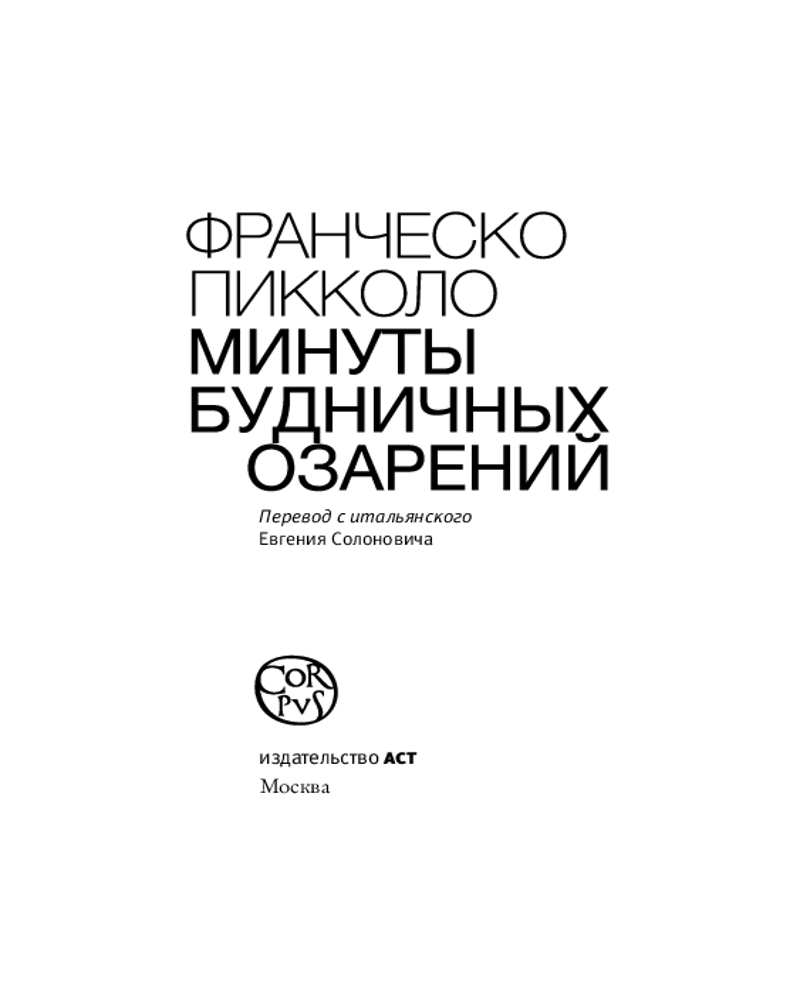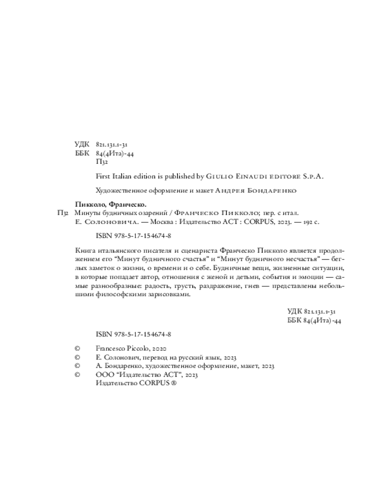 💳 Оплатить за товар можно при получении 🇰🇿 Есть бесплатная доставка по Казахстану от 1 дня 🎁 Копите бонусы с каждой покупки Серия: Corpus Книга итальянского писателя и сценариста Франческо Пикколо является продолжением его «Минут будничного счастья» и «Минут будничного несчастья» — беглых заметок о жизни, о времени и о себе. Будничные вещи, жизненные ситуации, в которые попадает автор, отношения с женой и детьми, события и эмоции — самые разнообразные: радость, грусть, раздражение, гнев — представлены небольшими философскими зарисовками. |