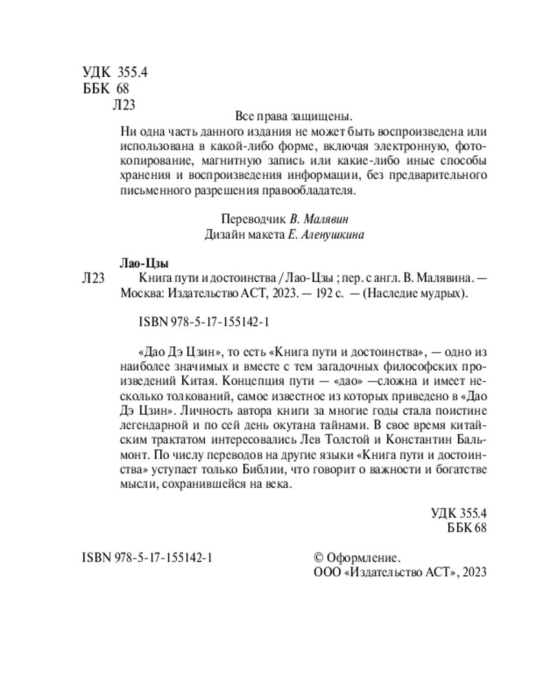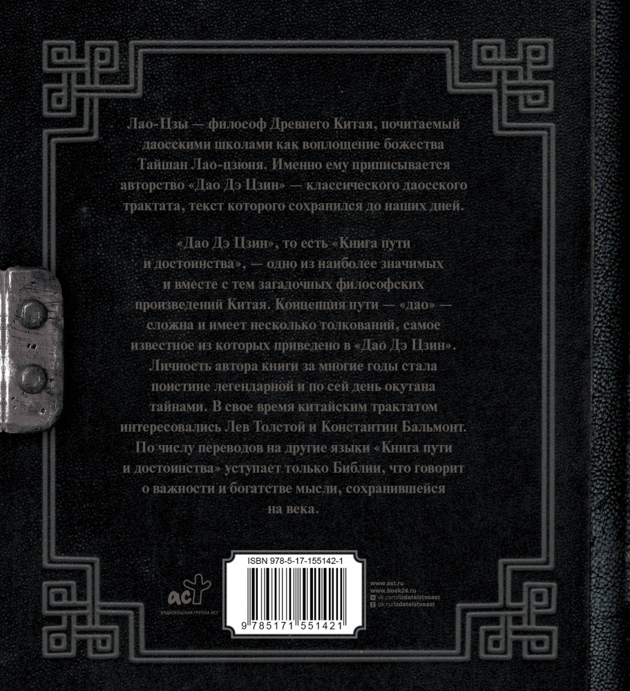 💳 Оплатить за товар можно при получении 🇰🇿 Есть бесплатная доставка по Казахстану от 1 дня 🎁 Копите бонусы с каждой покупки Серия: Наследие мудрых «Дао Дэ Цзин», то есть «Книга пути и достоинства», — одно из наиболее значимых и вместе с тем загадочных философских произведений Китая. Концепция пути — «дао» —сложна и имеет несколько толкований, самое известное из которых приведено в «Дао Дэ Цзин». Личность автора книги за многие годы стала поистине легендарной и по сей день окутана тайнами. В свое время китайским трактатом интересовались Лев Толстой и Константин Бальмонт. По числу переводов на другие языки «Книга пути и достоинства» уступает только Библии, что говорит о важности и богатстве мысли, сохранившейся на века. |