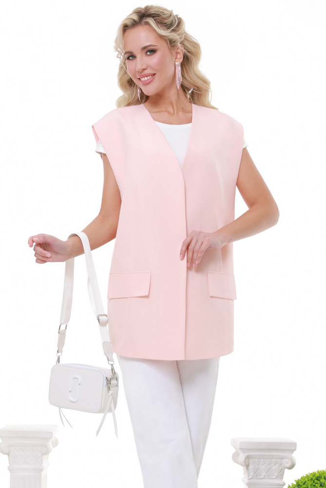 у жилета нет вытачек - совсем. Соответственно на груди всё топорщится. По сути это не жилет, а тряпочка на плечи. На спине тоже никаких вытачек. Ужасный крой. Плечи тоже несуразные. если у вас они узкие, то будет висеть как крылышки, а если широкие - с такой моделью плечи будут просто гигантскими.