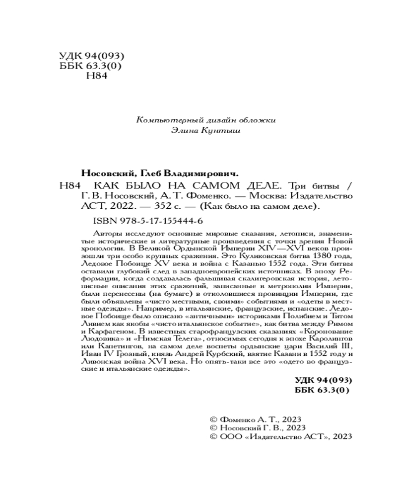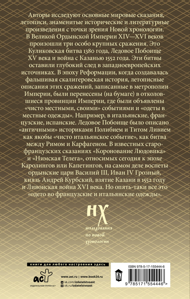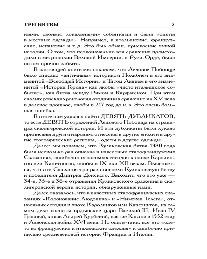 Как было на самом деле. Три БитвыАнатолий Тимофеевич Фоменко, Глеб Владимирович Носовский В данный момент этот товар отсутствует в продаже. Возможно, у нас найдется аналогичный или похожий товар здесь. Серия: Как было на самом деле... Авторы исследуют основные мировые сказания, летописи, знаменитые исторические и литературные произведения с точки зрения Новой хронологии. В Великой Ордынской Империи XIV-XVI веков произошли три особо крупных сражения. Это Куликовская битва 1380 года, Ледовое Побоище XV века и война с Казанью 1552 года. Эти битвы оставили глубокий след в западноевропейских источниках. В эпоху Реформации, когда создавалась фальшивая скалигеровская история, летописные описания этих сражений, записанные в метрополии Империи, были перенесены (на бумаге) в отколовшиеся провинции Империи, где были объявлены «чисто местными, своими» событиями и «одеты в местные одежды». Например, в итальянские, французские, испанские. Ледовое Побоище было описано «античными» историками Полибием и Титом Ливием как якобы «чисто итальянское событие», как битва между Римом и Карфагеном. В известных старофранцузских сказаниях «Коронование Людовика» и «Нимская Телега», относимых сегодня к эпохе Каролингов или Капетингов, на самом деле воспеты ордынские цари Василий III, Иван IV Грозный, князь Андрей Курбский, взятие Казани в 1552 году и Ливонская война XVI века. Но, опять-таки, все это «одето во французские и итальянские одежды». |