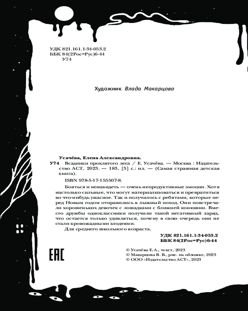 💳 Оплатить за товар можно при получении 🇰🇿 Есть бесплатная доставка по Казахстану от 1 дня 🎁 Копите бонусы с каждой покупки Серия: Самая страшная детская книга Бояться и ненавидеть — очень непродуктивные эмоции. Хотя настолько сильные, что могут материализоваться и превратиться во что-нибудь ужасное. Так и получилось с ребятами, которые перед Новым годом отправились в лыжный поход. Они повстречали хорошеньких девочек с лошадками с ближней конюшни. Вместо дружбы одноклассники получили такой негативный заряд, что остается только удивляться, почему в свою очередь они не стали кровожадными злодеями. |