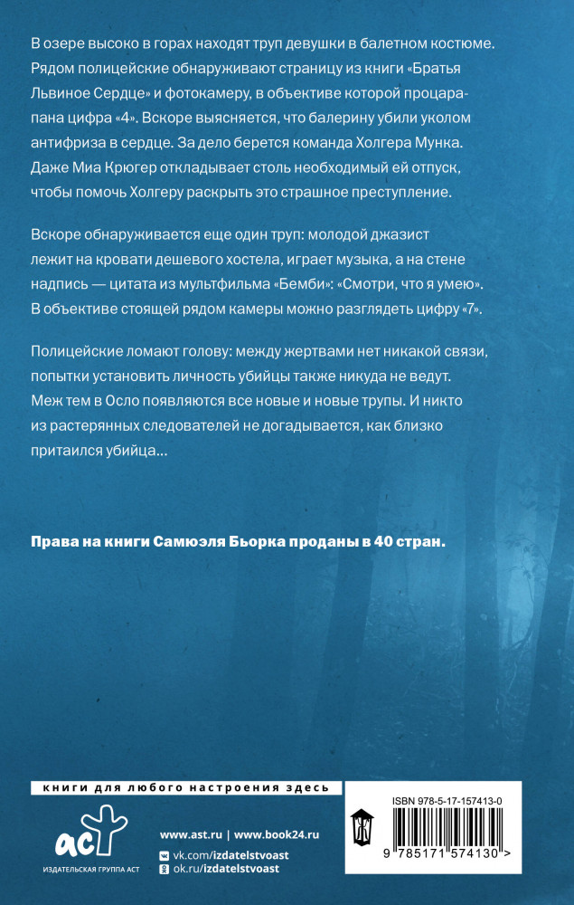 💳 Оплатить за товар можно при получении 🇰🇿 Есть бесплатная доставка по Казахстану от 1 дня 🎁 Копите бонусы с каждой покупки Серия: Звезды скандинавского триллера В озере высоко в горах находят труп девушки в балетном костюме. Рядом полицейские обнаруживают страницу из книги «Братья Львиное Сердце» и фотокамеру, в объективе которой процарапана цифра «4». Вскоре выясняется, что балерину убили уколом антифриза в сердце. За дело берется команда Холгера Мунка. Даже Миа Крюгер откладывает столь необходимый ей отпуск, чтобы помочь Холгеру раскрыть это страшное преступление. |