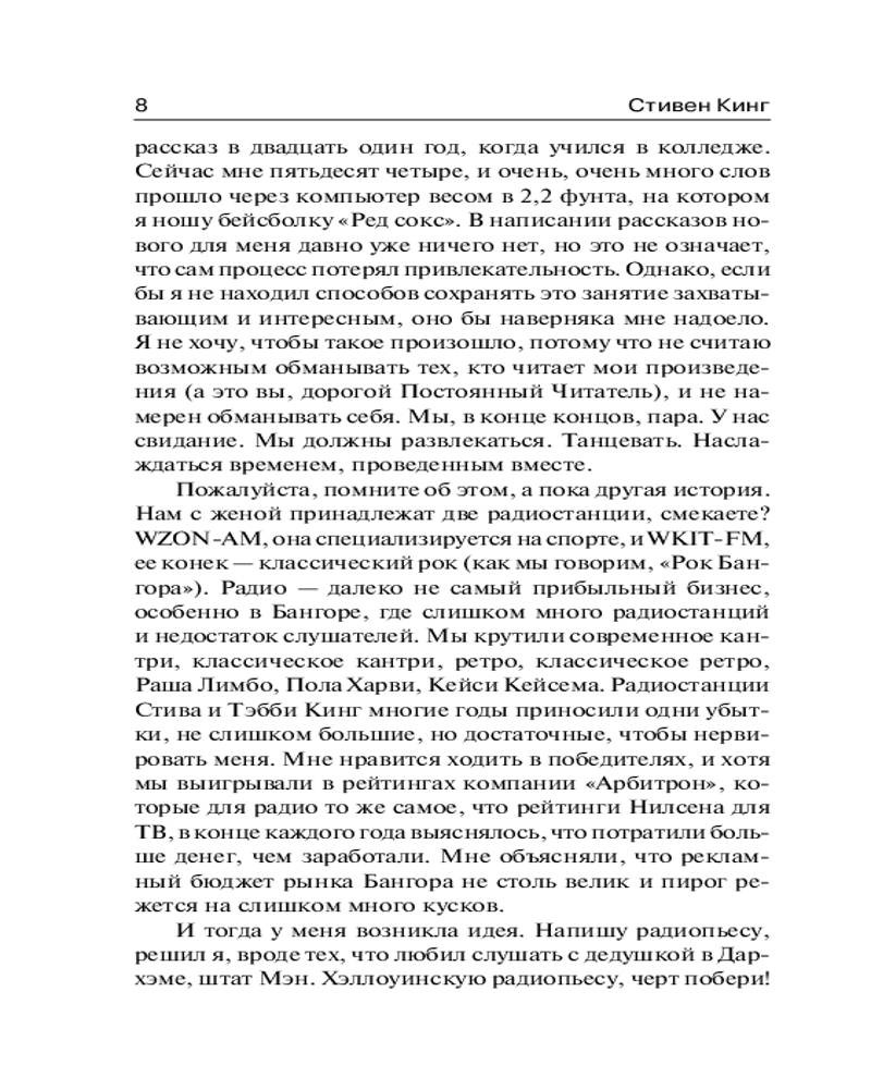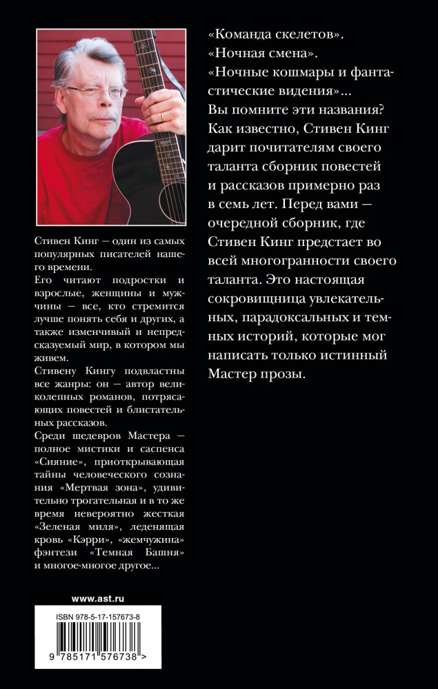 💳 Оплатить за товар можно при получении 🇰🇿 Есть бесплатная доставка по Казахстану от 1 дня 🎁 Копите бонусы с каждой покупки Серия: Темная Башня «Команда скелетов». «Ночная смена». «Ночные кошмары и фантастические видения»... Вы помните эти названия? Как известно, Стивен Кинг дарит почитателям своего таланта сборник повестей и рассказов примерно раз в семь лет. Перед вами — очередной сборник, где Стивен Кинг предстает во всей многогранности своего таланта. Это настоящая сокровищница увлекательных, парадоксальных и темных историй, которые мог написать только истинный Мастер прозы. |