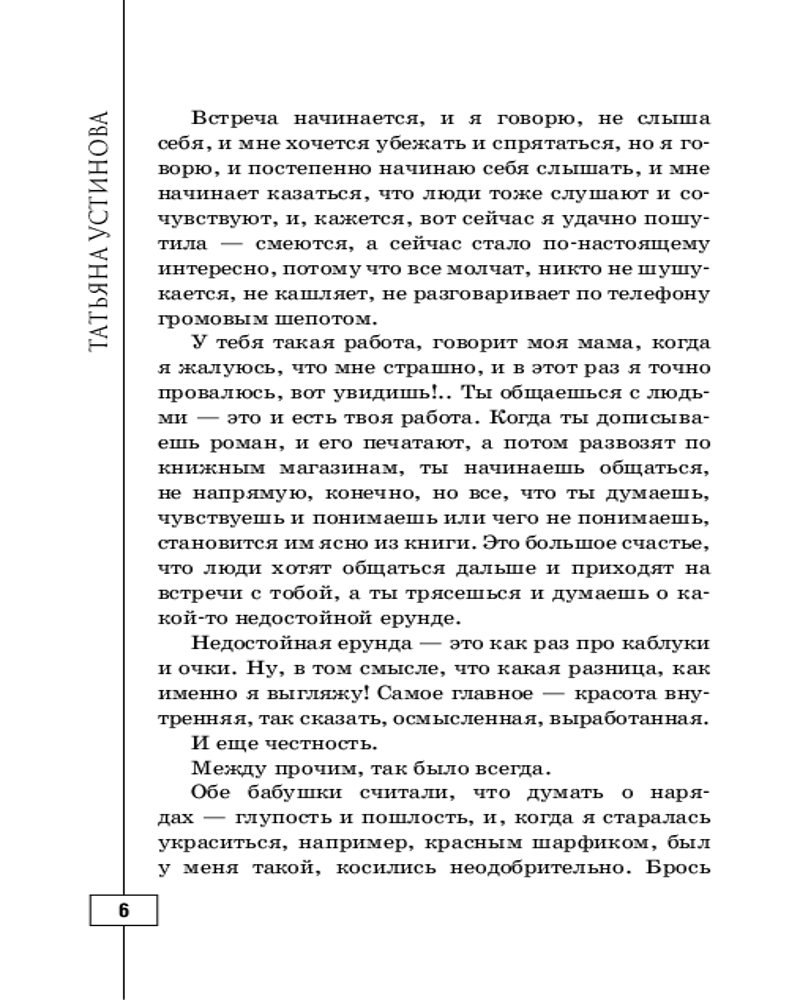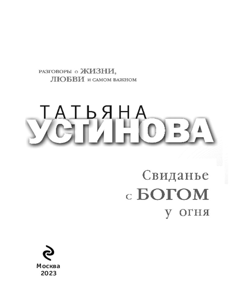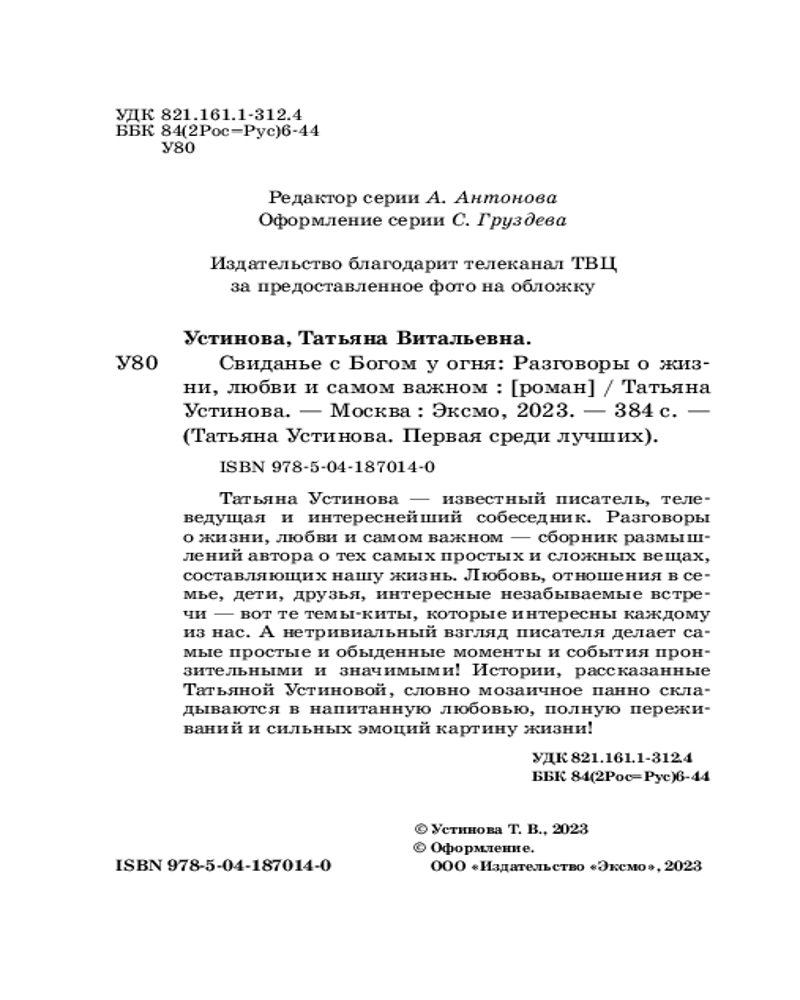 Свиданье с Богом у огня: Разговоры о жизни, любви и самом важномлегко читается поучительная маленькие рассказы интересно В данный момент этот товар отсутствует в продаже. Возможно, у нас найдется аналогичный или похожий товар здесь. Серия: Татьяна Устинова. Первая среди лучших (обложка) Татьяна Устинова — известный писатель, телеведущая и интереснейший собеседник. Разговоры о жизни, любви и самом важном — сборник размышлений автора о тех самых простых и сложных вещах, составляющих нашу жизнь. Любовь, отношения в семье, дети, друзья, интересные незабываемые встречи — вот те темы-киты, которые интересны каждому из нас. А нетривиальный взгляд писателя делает самые простые и обыденные моменты и события пронзительными и значимыми! Истории, рассказанные Татьяной Устиновой, словно мозаичное панно, складываются в напитанную любовью, полную переживаний и сильных эмоций картину жизни! |